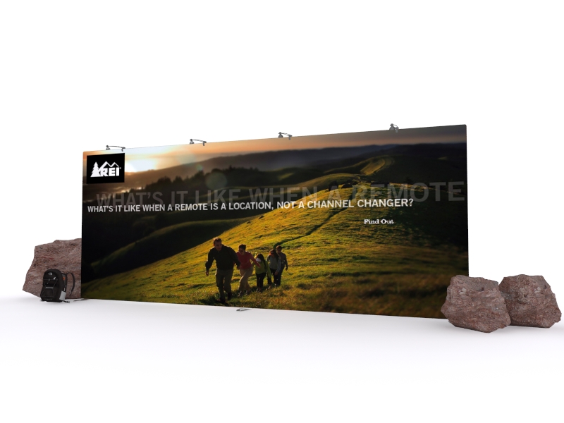 Graphics: Primarily one large tension fabric graphic @ 7.5 ft x 6.75 ft with a smaller tension fabric graphic and/or direct print graphics. Velcro tension fabric connections.
