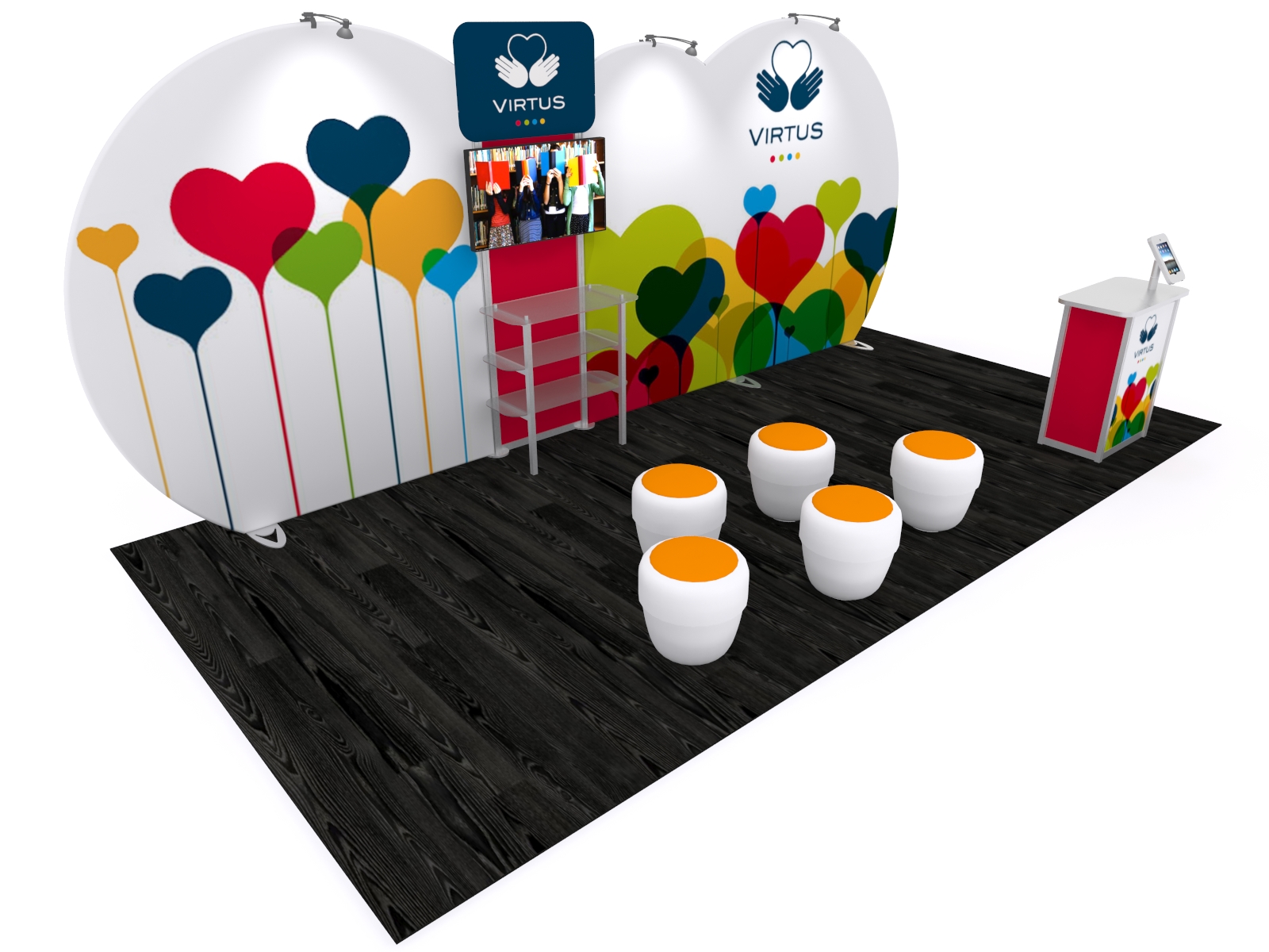 The Wow! Factor is often missing for most trade show exhibitors. They choose a safe display rather than one that's bold and distinctive. The TF-512 and TF-522 feature a flowing, powerful visual design with practical features like a large monitor, shelves, and locking storage. The MOD-1551 reception counter contributes to the graphic messaging and offers a convenient swivel iPad or Surface Tablet Mount. Add furniture for seating or meeting areas to complete the "meet and greet" mission of your trade show. And because the displays are re-configurable, you can switch between a 10 ft. or 20 ft. inline depending on your show.