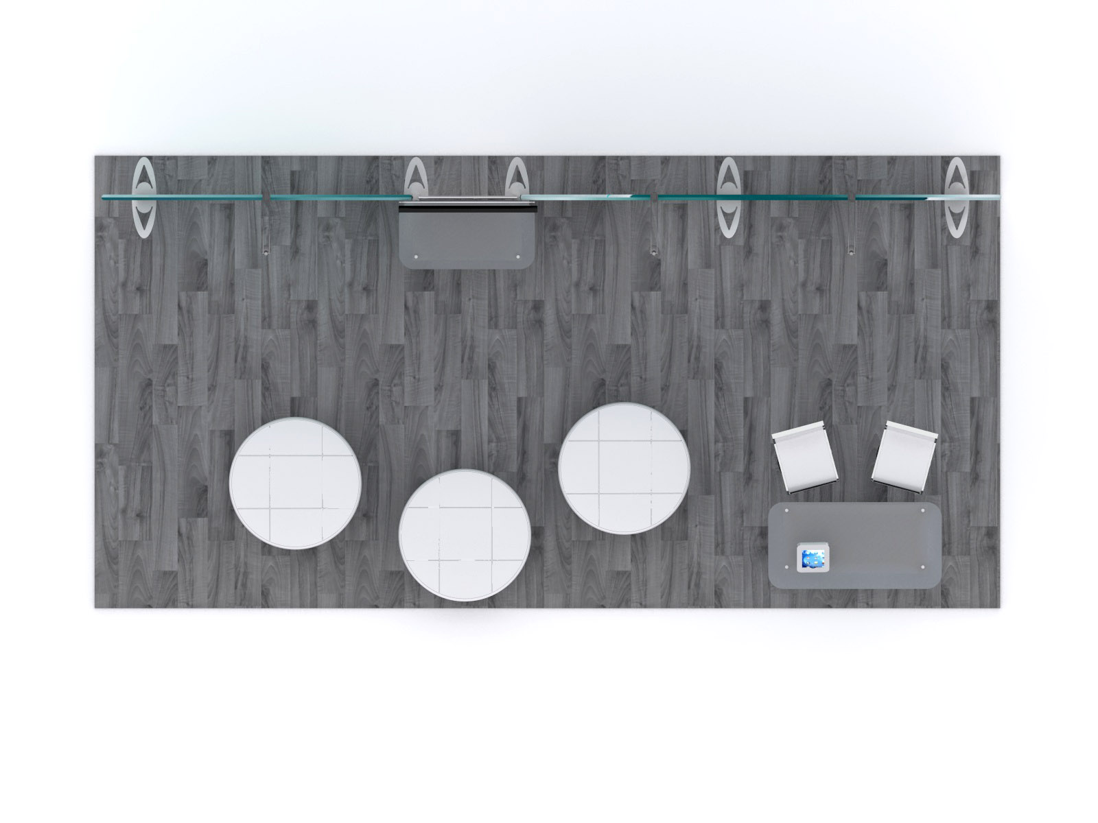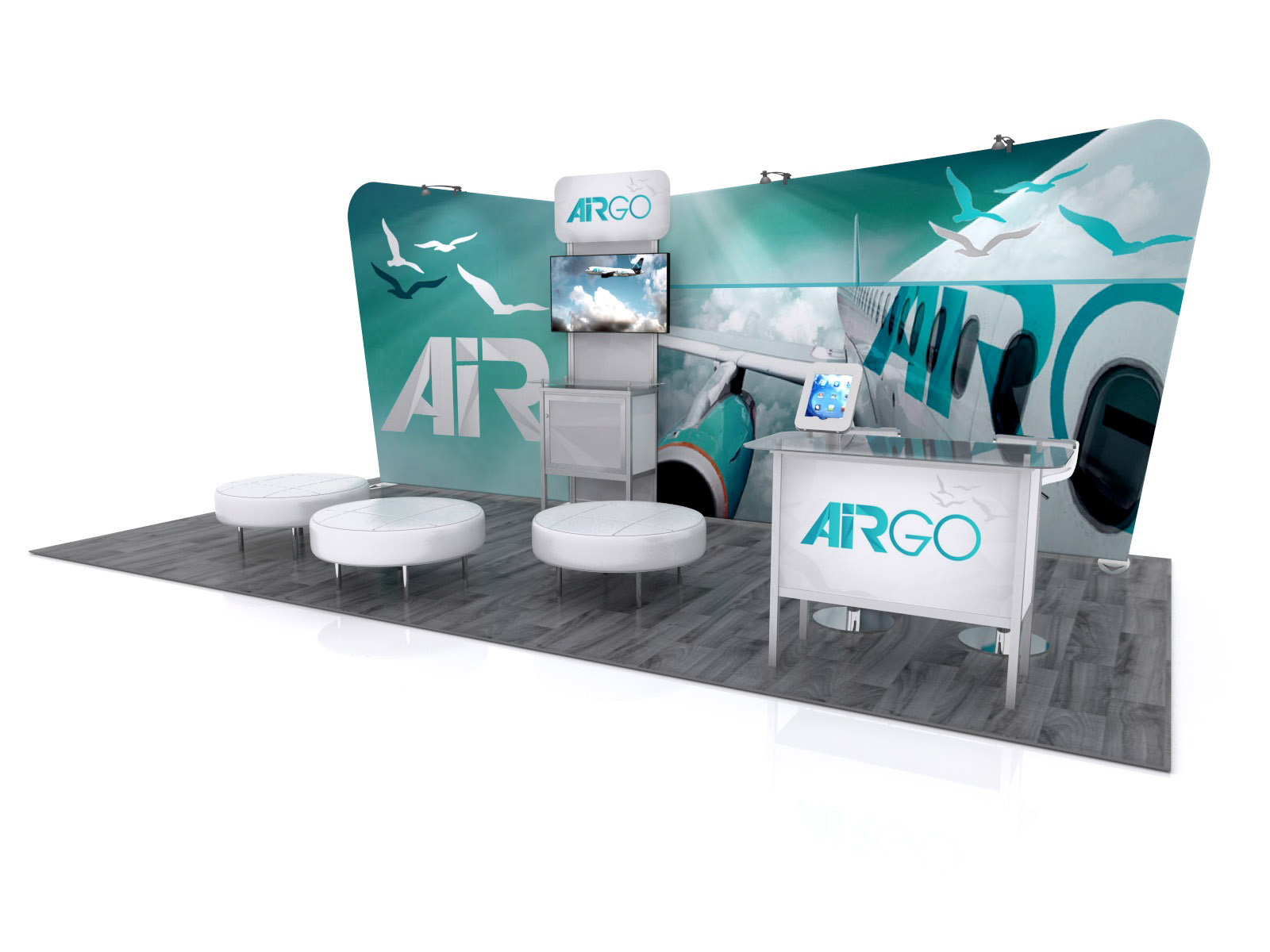 The Wow! Factor is often missing for many trade show exhibits. Exhibitors choose a safe display rather than one that's bold and distinctive. The TF-513 and TF-523 feature a powerful visual design with practical features like a large monitor, backwall counter, and locking storage. The MOD-1552 reception counter contributes to the graphic messaging and offers a convenient swivel iPad or Surface Tablet Mount. Add furniture for seating or meeting areas to complete the "meet and greet" mission of your trade show. And because the displays are re-configurable, you can switch between a 10 ft. or 20 ft. inline depending on your show.
