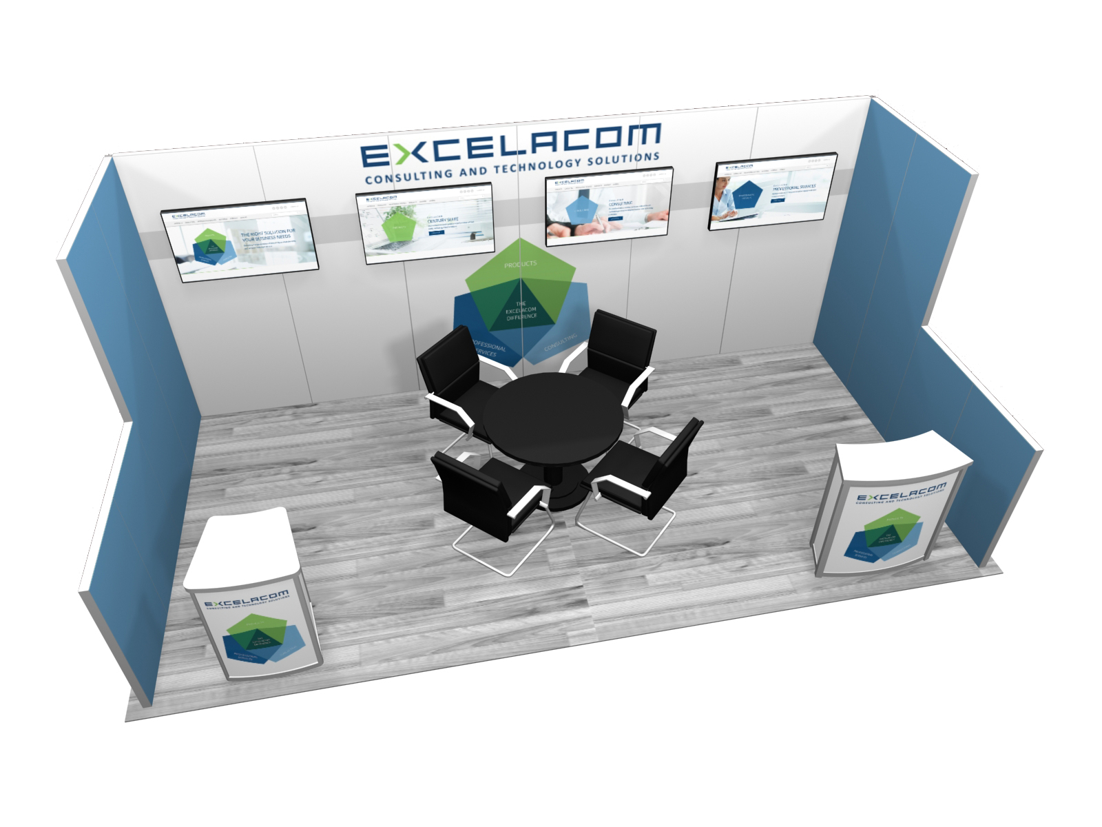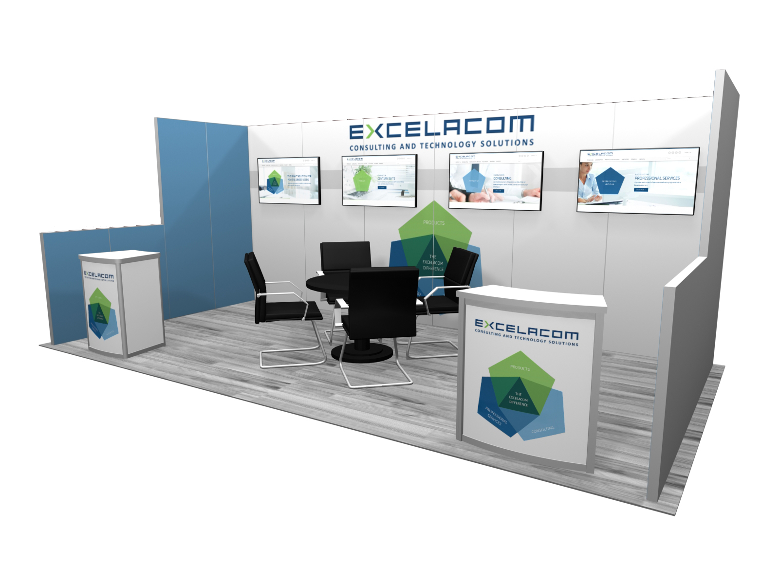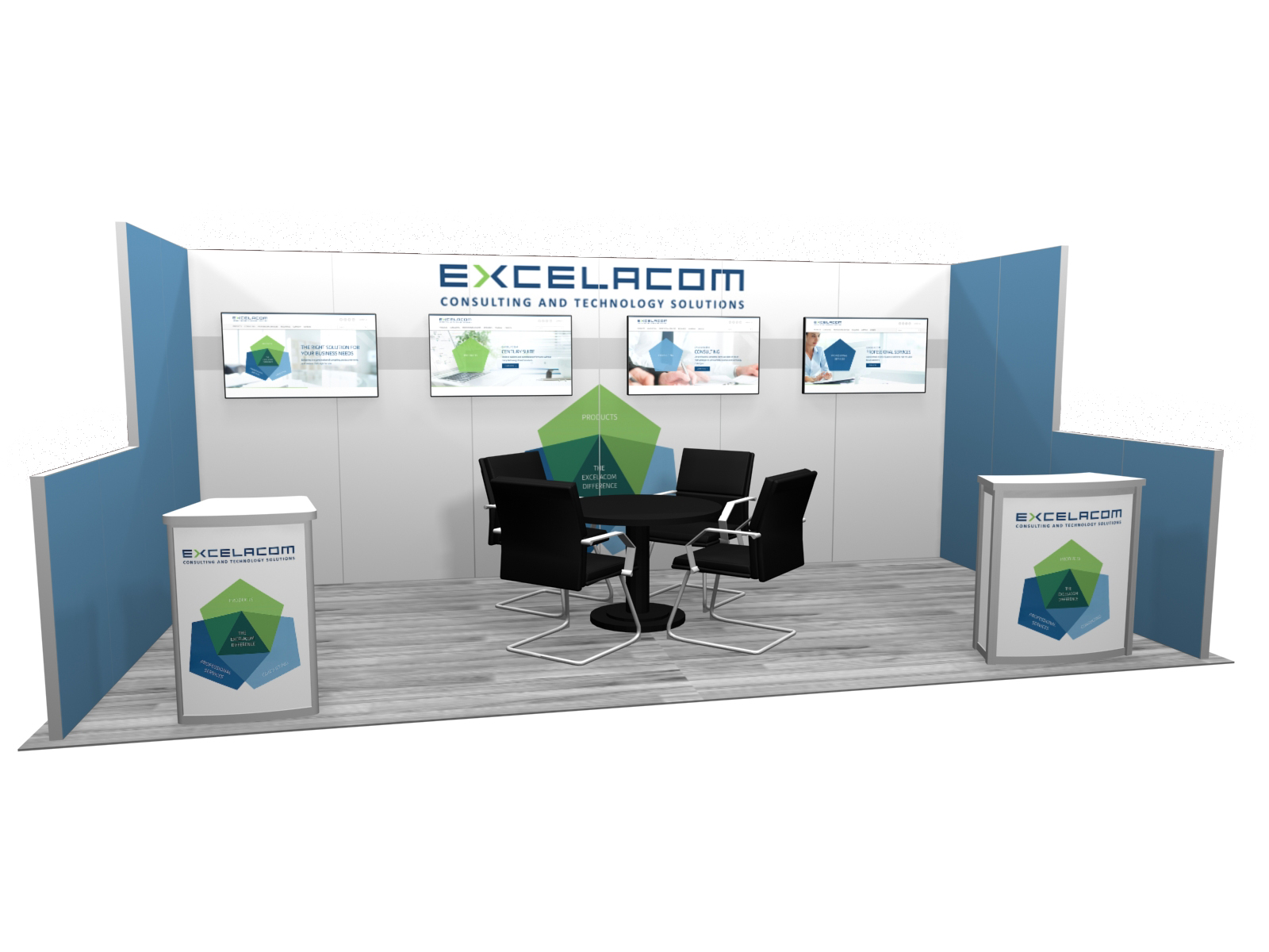 The rental exhibits gallery includes a variety of workstations with locking doors for storage, product shelves, and monitors. The arch-shape and flat canopies add an attractive design element to many rental design options. Most of the inline rental exhibits pack and ship in one crate and are easy to set up. For your peace of mind, we stage and photograph every exhibit before shipping to ensure your graphics look great and fit perfectly.