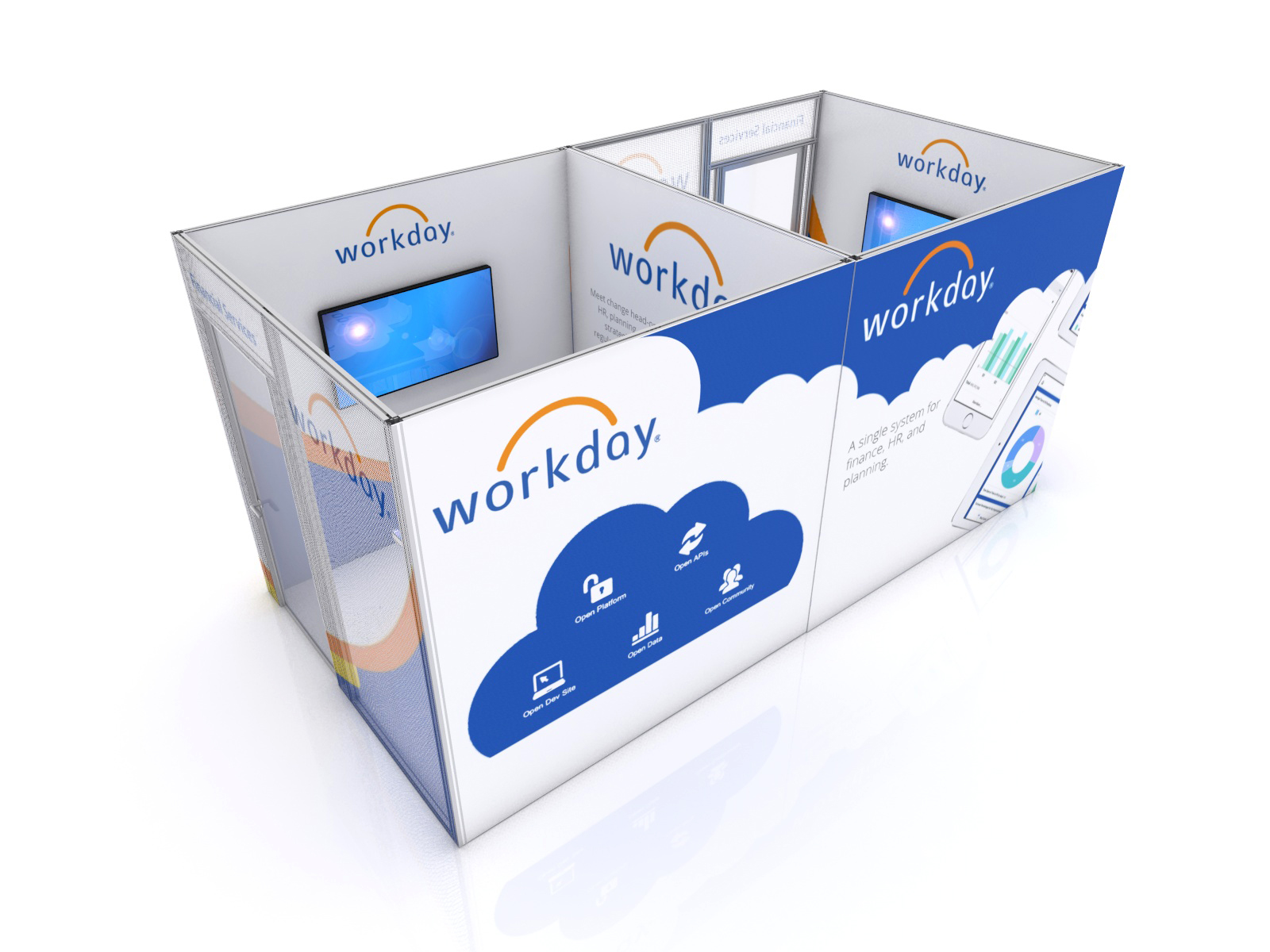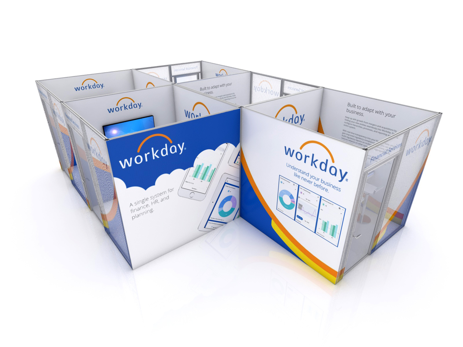 The two-sided panels are designed for either direct print graphics or SEG fabric graphics. There's internal wire management, and shelves, counters, monitor mounts, tablet kiosks, and charging stations are available for either purchase or rent. Most pod configurations pack in one or two crates, saving you on freight and drayage (material handling). And assembly takes half the time of traditional heavy meeting modules. While there are modular panel wannabes, only Gravitee combines no tools, no loose parts, and a lifetime warranty on workmanship. Rental or purchase options are available