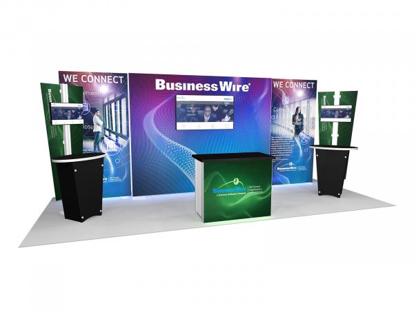 When it's ALL BUSINESS, consider the RE-2099 rental exhibit. The large backlit graphics will attract attention, and the balanced design with monitors left, right, and center makes it easy to demo products and services with multiple trade show attendees. The RE-2099 comes with (2) RE-1223 Workstations with monitor, graphics, and locking storage. The RE-1567 reception counter is backlit and includes ample locking storage. This rental exhibit means business!