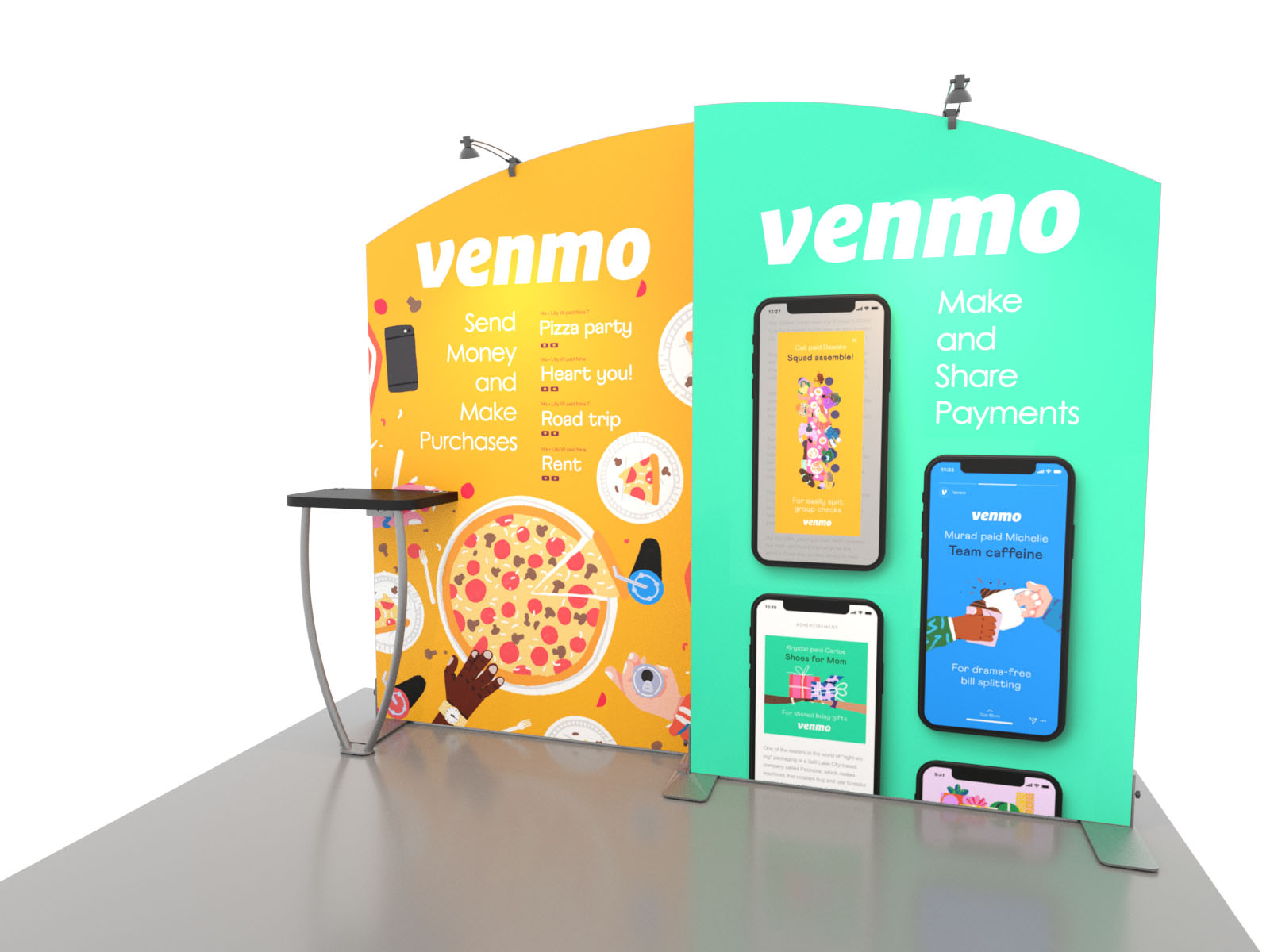 Personalize your Symphony Display with attractive counters, workstations, floating graphics, iPad clamshells, and monitor mounts. The lightweight aluminum frames are engineered for SEG dye-sublimated fabric graphics for a seamless, wrinkle-free look. Add floating graphics for additional visual layering and branding.