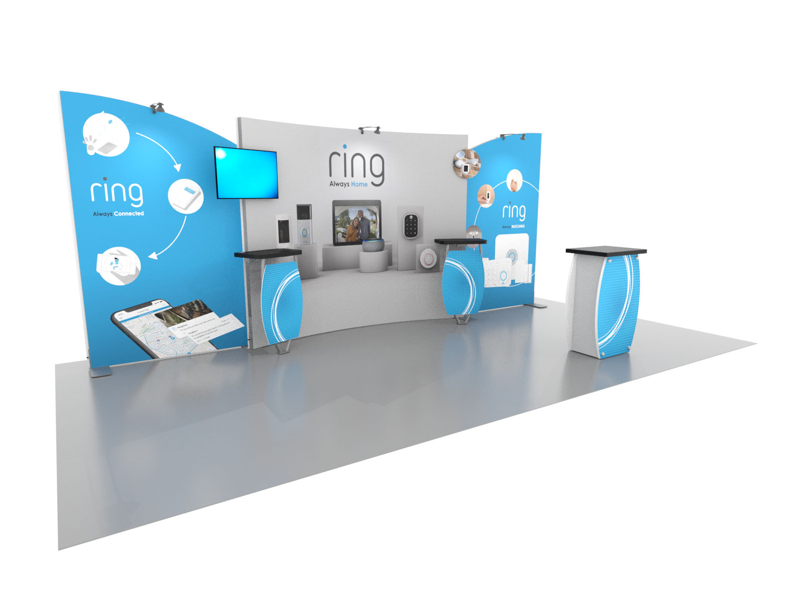 Personalize your Symphony Display with attractive counters, workstations, floating graphics, iPad clamshells, and monitor mounts. The lightweight aluminum frames are engineered for SEG dye-sublimated fabric graphics for a seamless, wrinkle-free look. Add floating graphics for additional visual layering and branding.