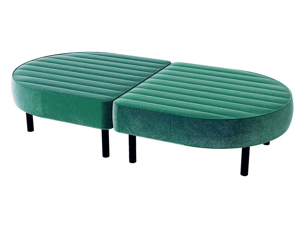 This retro-vibe, green velvet oval ottoman with a modern flair is compact, comfortable and stylish. Dims: 69" L x 34.5" D x 15" H