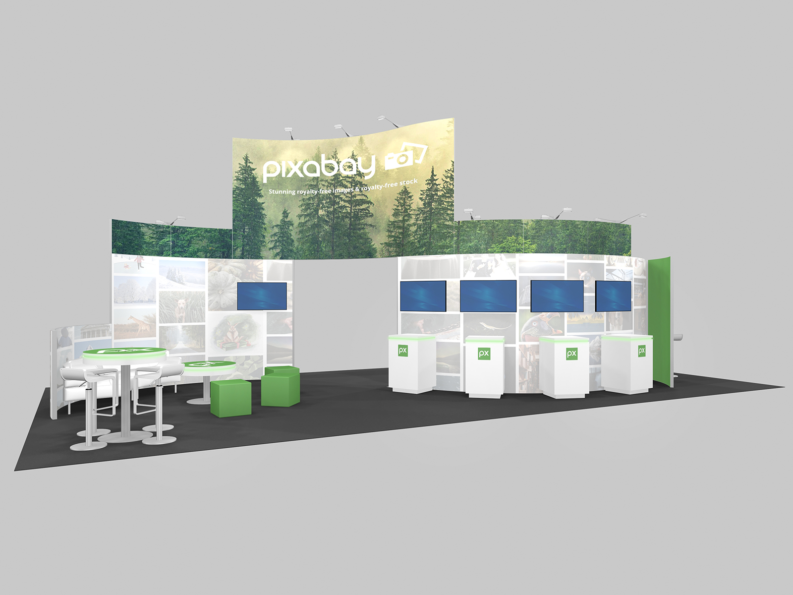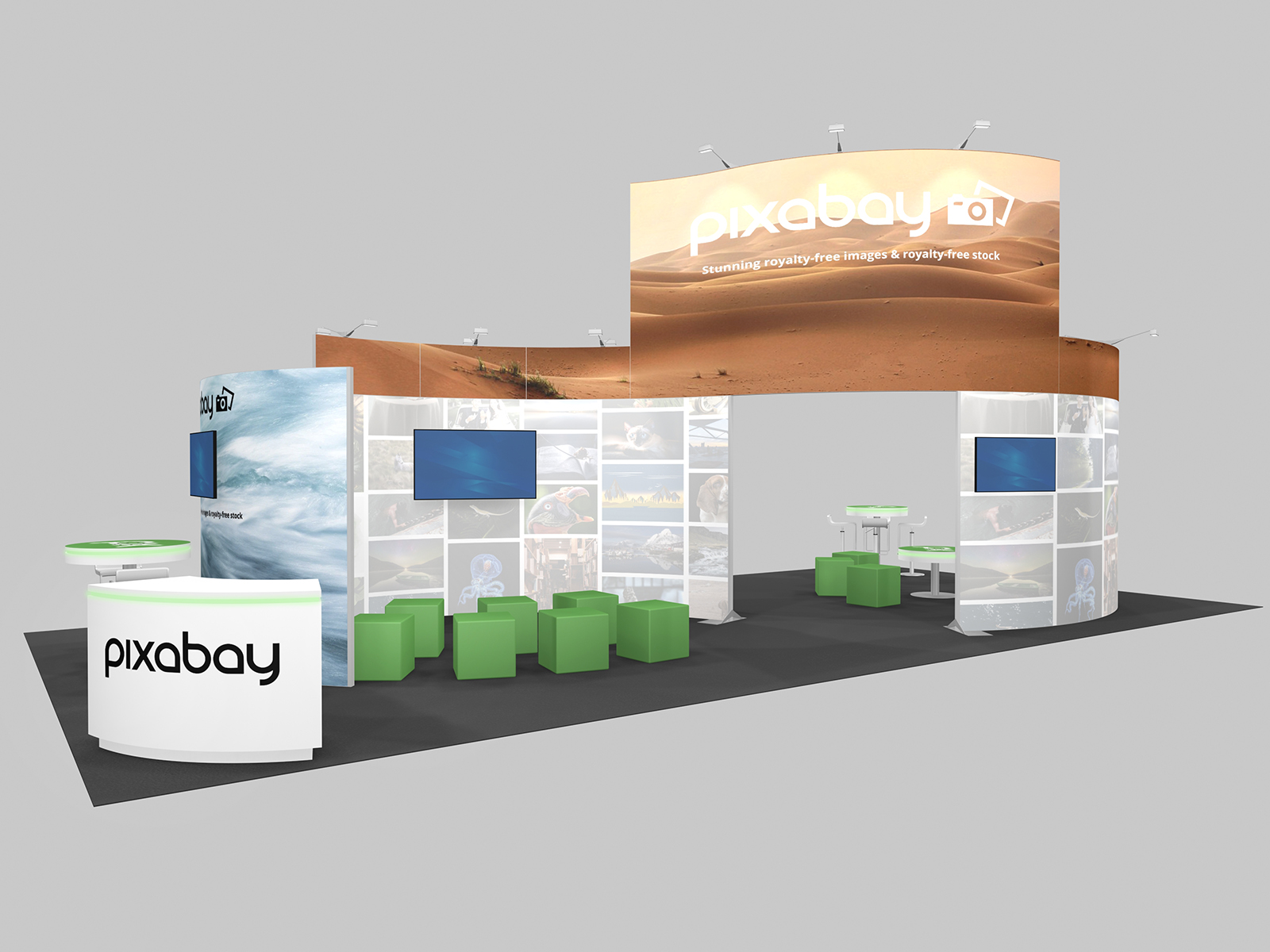 Quite often, a few custom elements added to the design can give the entire design a custom look even if it’s as simple as some colorful laminated workstations, shelves, or a reception counter. Custom laminated soffits and backlighting are also nice touches that are inexpensive and well worth the investment. As a bonus, if you re-rent the same exhibit, your second rental will most likely be less expensive, since your first rental covered the cost of those custom components.
