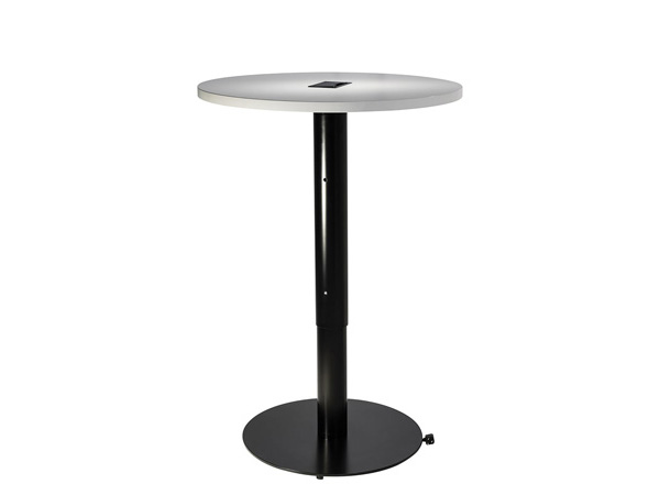 -- Trade Show Furniture RentalModern 30" round bar table with black metal base features a power hub in the center with 1 AC and 2 USB ports, and wire management in the base. One 110V power source is required. Dims: 30" RND x 42"H