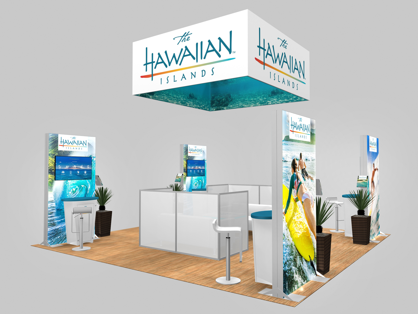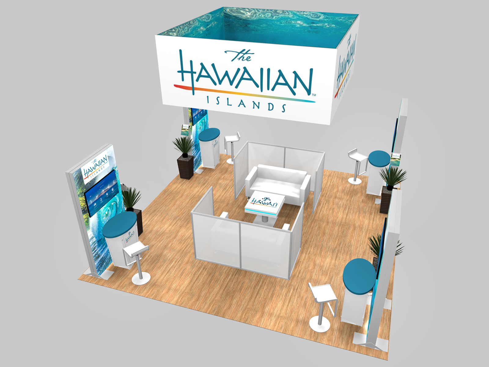 A well-designed rental island exhibit should be attractive, inviting, informative, and practical. The RE-9148, 9149, and 9150 series does all that... and more. It combines SuperNova lightboxes and vibrant graphics with upscale monitor kiosks in a booth design that welcomes business conversations and problem solving. There are multiple locking counters and smart configurations to fit most trade show requirements. The 12 ft. high central tower is perfect for storing product samples and equipment (RE-9148). The backlit double-sided SuperNova lightbox with monitor mounts is ideal for attracting attention and conducting demos (RE-9149) And the semi-private meeting room is perfect for companies that require a comfortable space to conduct business (RE-9150). The square overhead sign featured in RE-9150 can be added to all three configurations.