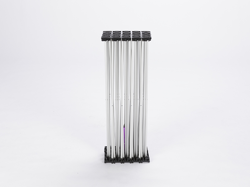 The fabric or graphic panels hang on pins that adhere to detachable steel channel bars with a magnet-to-metal connection. The panels are rollable to fit in the roto-molded case with wheels. The number of panels depends on the size of the frame.