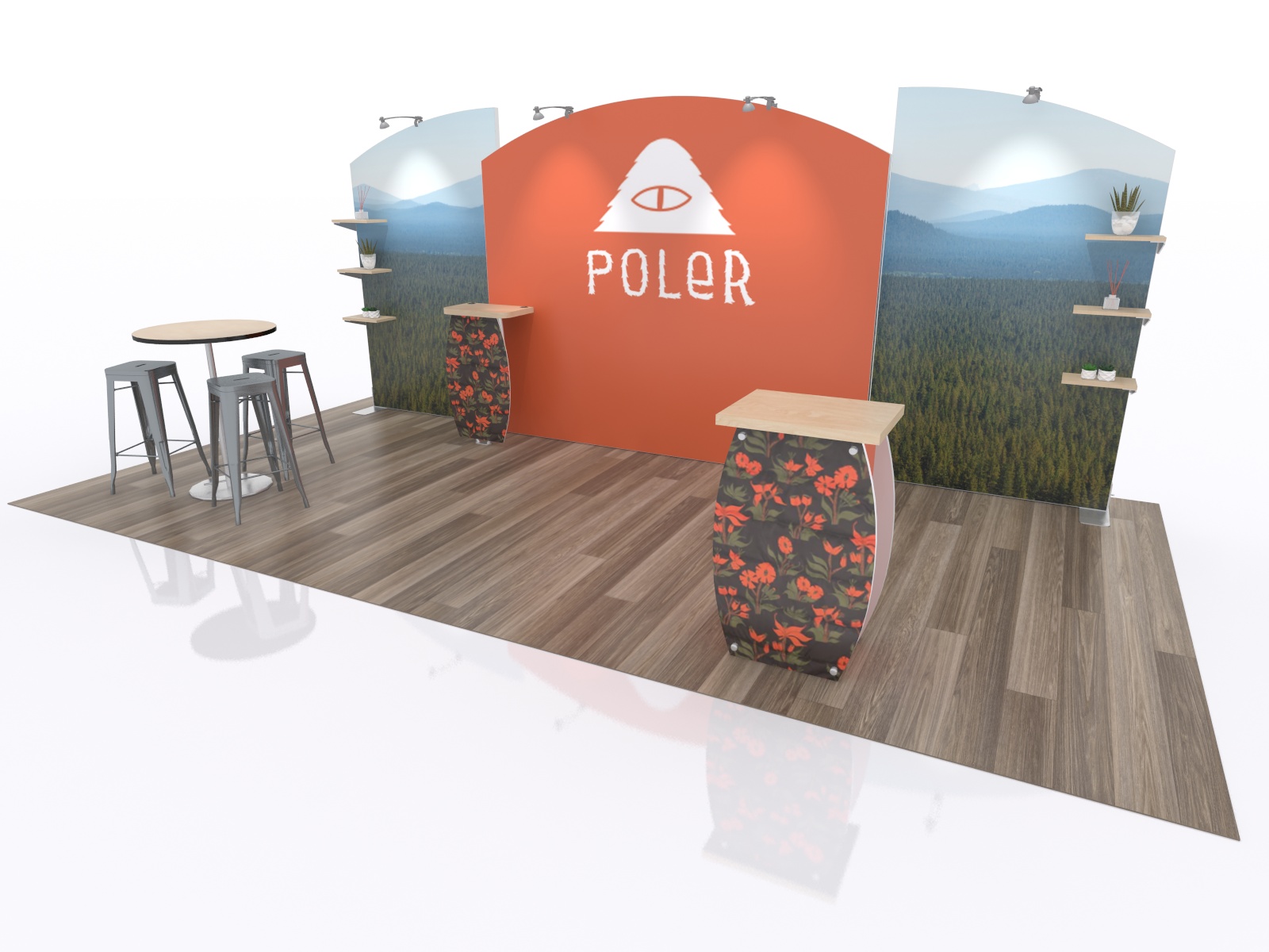 Personalize your Symphony Display with attractive counters, workstations, floating graphics, iPad clamshells, and monitor mounts. The lightweight aluminum frames are engineered for SEG dye-sublimated fabric graphics for a seamless, wrinkle-free look. Add floating graphics for additional visual layering and branding.