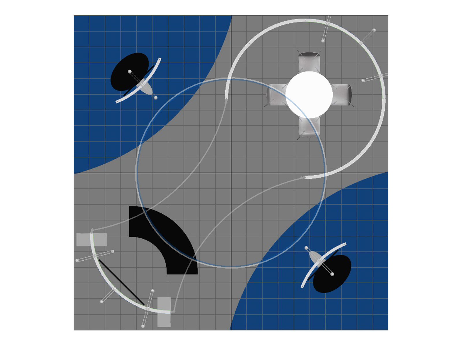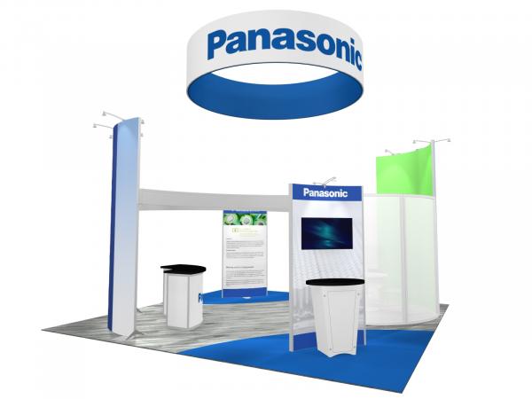 Put simply, Occam's Razor states: “The simplest solution is almost always the best.” The RE-9164 Island manages to be both beautiful and welcoming while maximizing the 20 x 20 floor space. It features multiple large format graphics and an overhead hanging sign to draw attention from across the show hall. There are several open entrances along with a contemporary curved reception counter (with branding). The two counter/kiosks stations are perfect for sales presentations, and the large comfortable lounge and charging table makes it easy and convenient to relax with clients. it's simple, straightforward, and inviting.