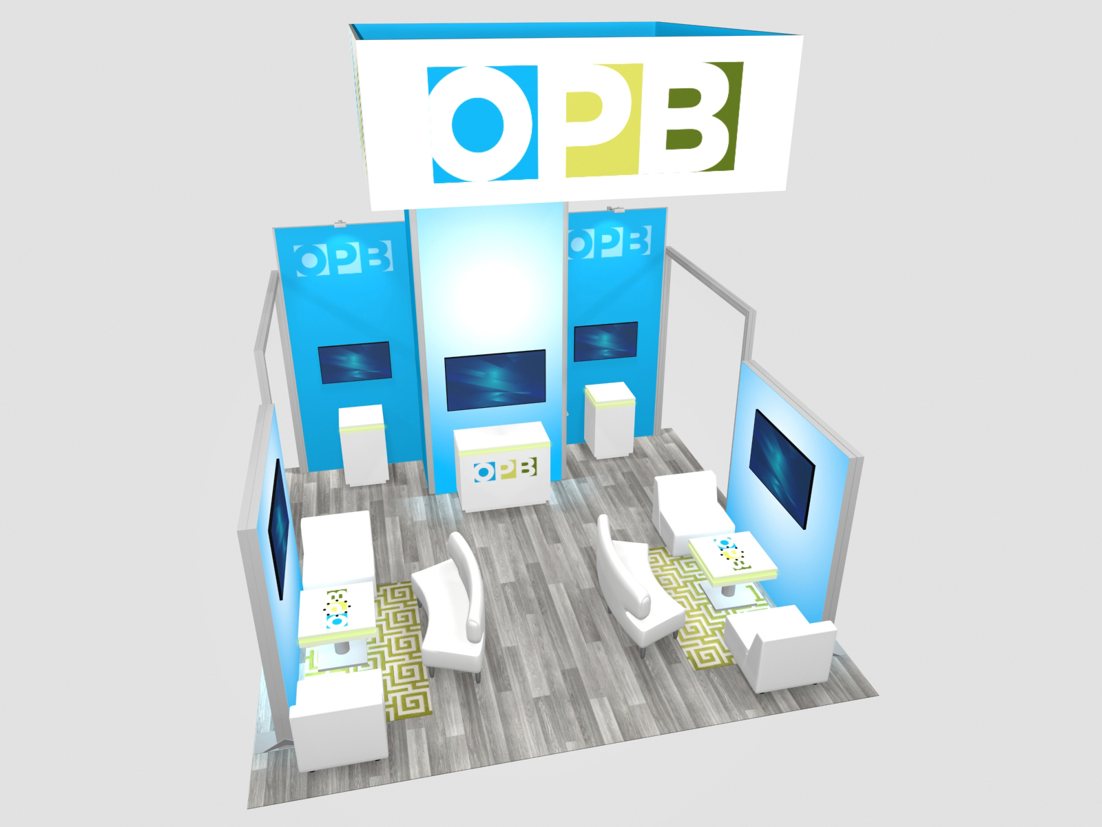 Many exhibitors prefer an island peninsula configuration with three-sided entries into the booth (rather than four in a traditional island) The RE-9165 Peninsula comes with a 12 ft. H x 9 ft. W storage tower with graphics and a 12 ft. archway and graphic header. It includes (4) double-sided SuperNova lightboxes with SEG fabric graphics. There are 5 monitor mounts, one each on the lightboxes and one on the tower. There's a walk-in closet storage and (4) laminate counters and (1) reception counter all with locking storage. If that wasn't enough, there's also (3) bistro charging tables with LED accent lights.