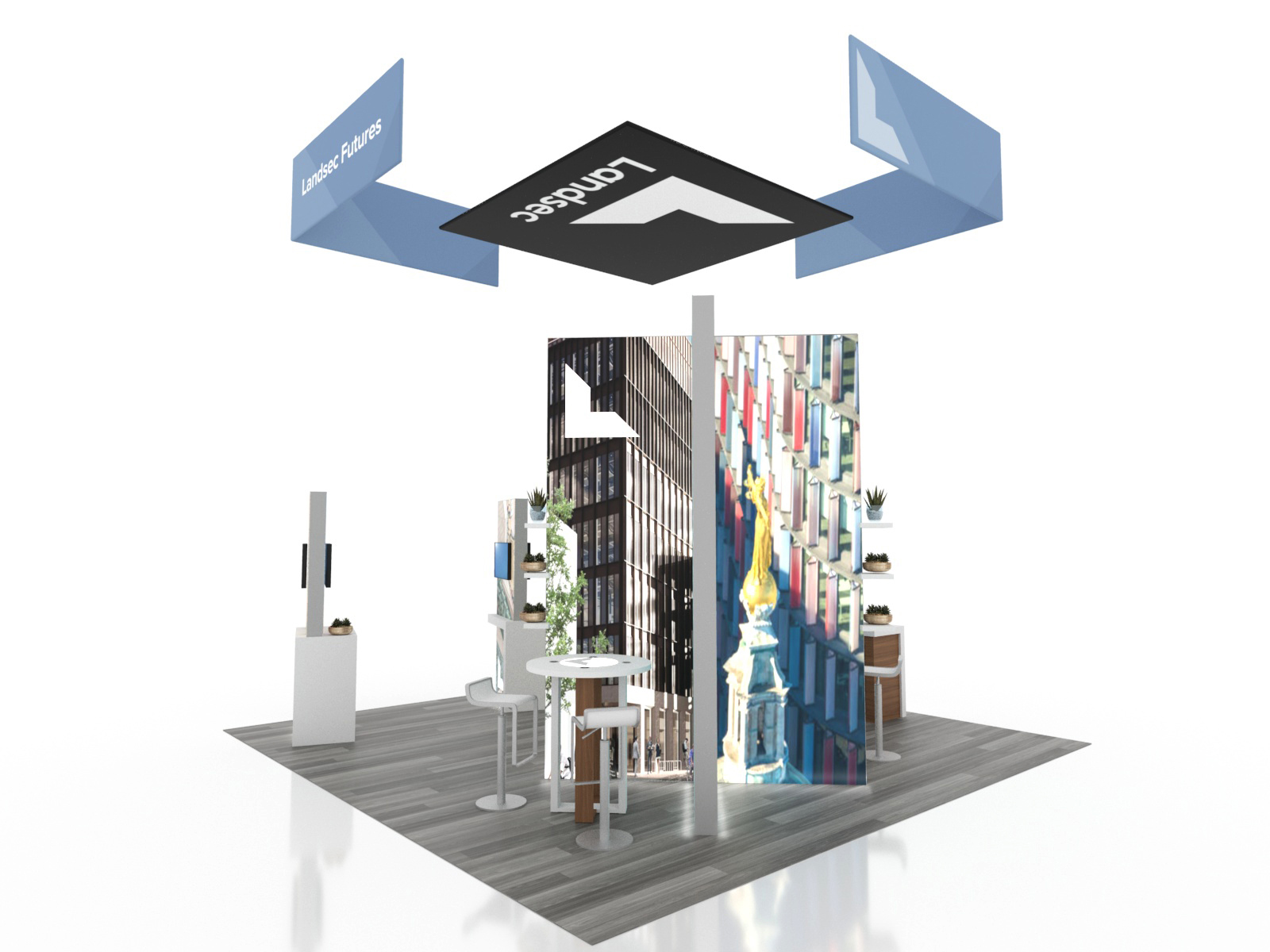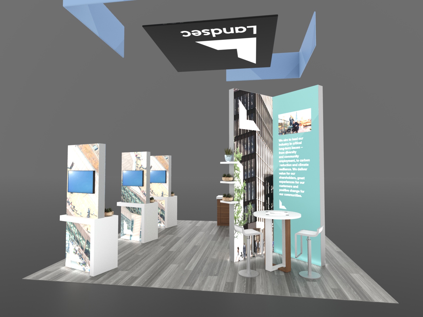 Three wraparound workstations with double-sided backlit graphics and six monitor mounts are perfect for casual product demos. There’s even seating with (2) contemporary charging tables. The overhead hanging signs will attract attention (and crowds) from throughout the show hall.