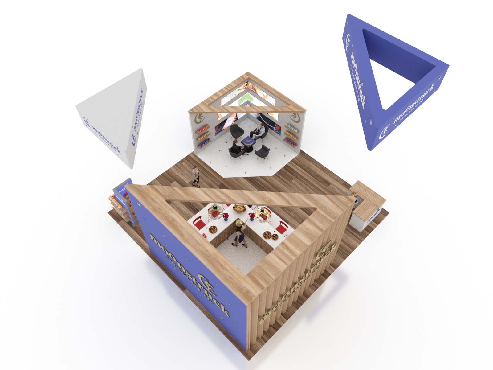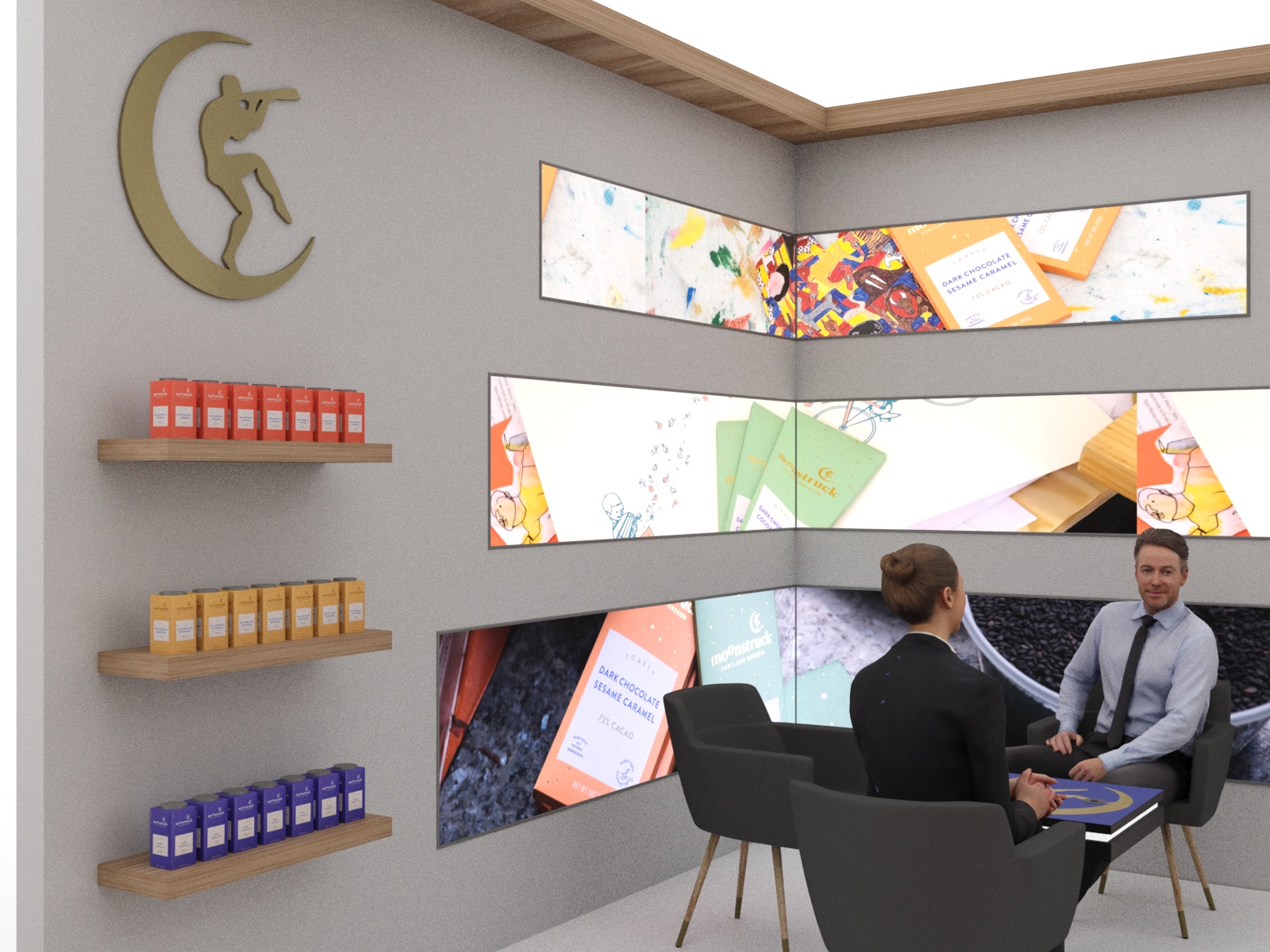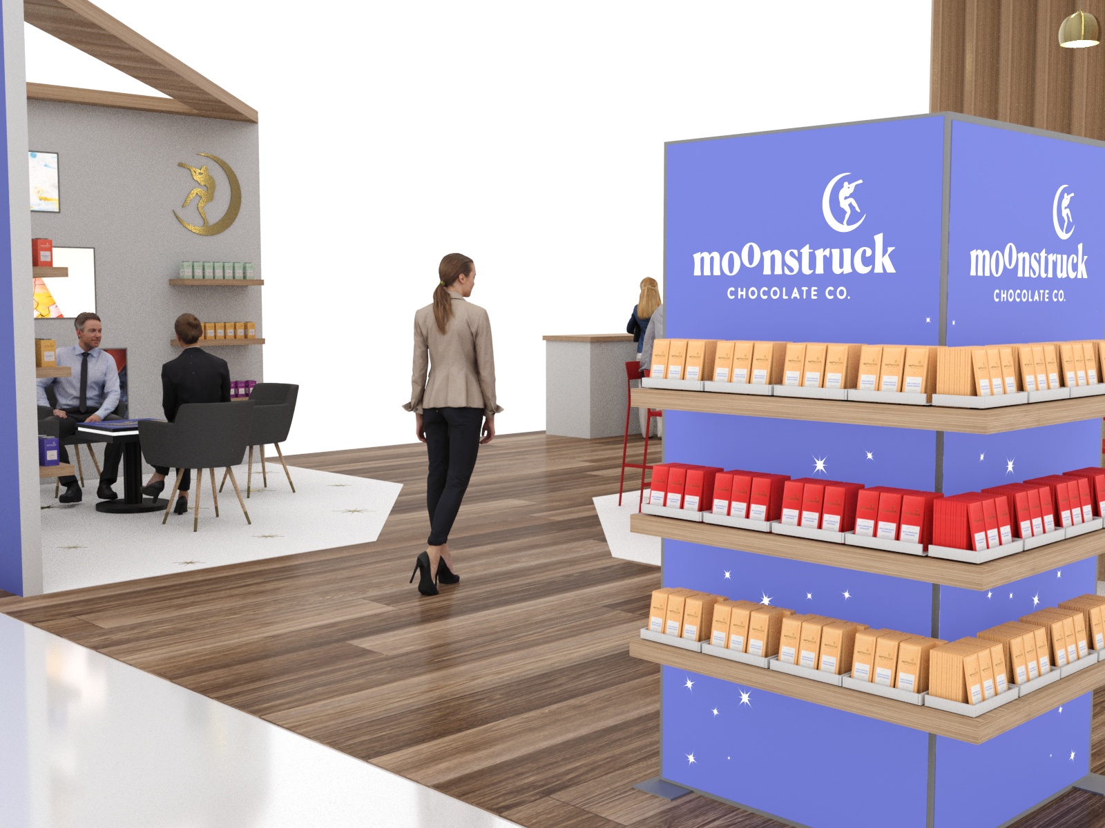 Discovering new products and services are two reasons why people attend trade shows. When exhibitors make that easy and exciting, they attract more attendees to their booth. The VK-5182 island is designed to attract potential clients with an open floorplan, distinctive branding, and casual seating. The 30 x 30 space encourages attendees to sit and sample products while relaxing in the booth. There’s a larger demo/sampling area and a smaller, informal meeting area for business conversations with potential clients. The design emphasizes branding along the aisles while prioritizing products and lifestyle branding within the booth.