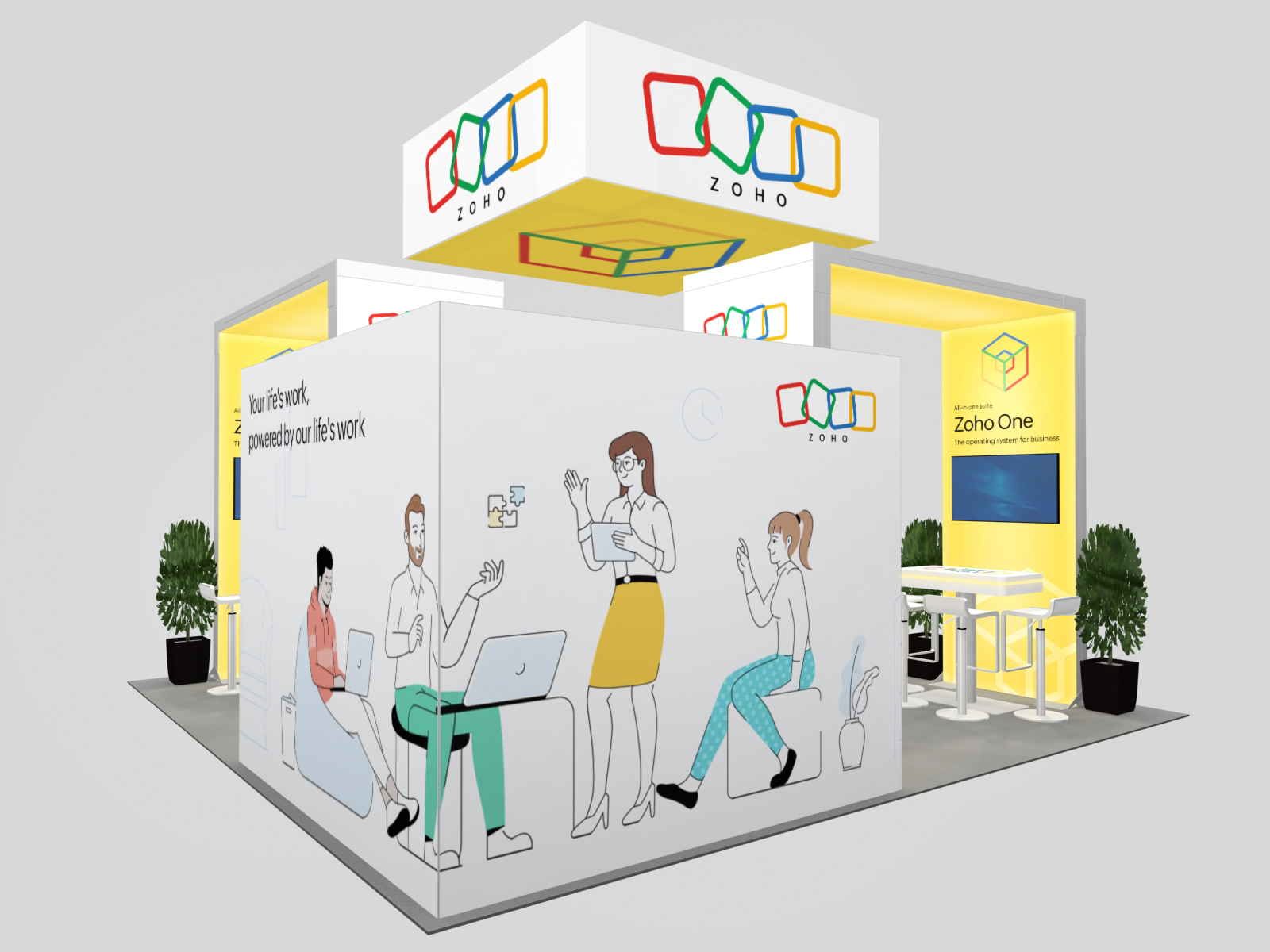 The relaxed open floor plan creates the perfect environment for meetings and casual discussions. All three designs include multiple monitor mounts, locking storage, and a large hanging sign for attention-grabbing visibility in the exhibit hall. Consider adding rental plants, as shown in two of the designs, for an even more casual vibe.
