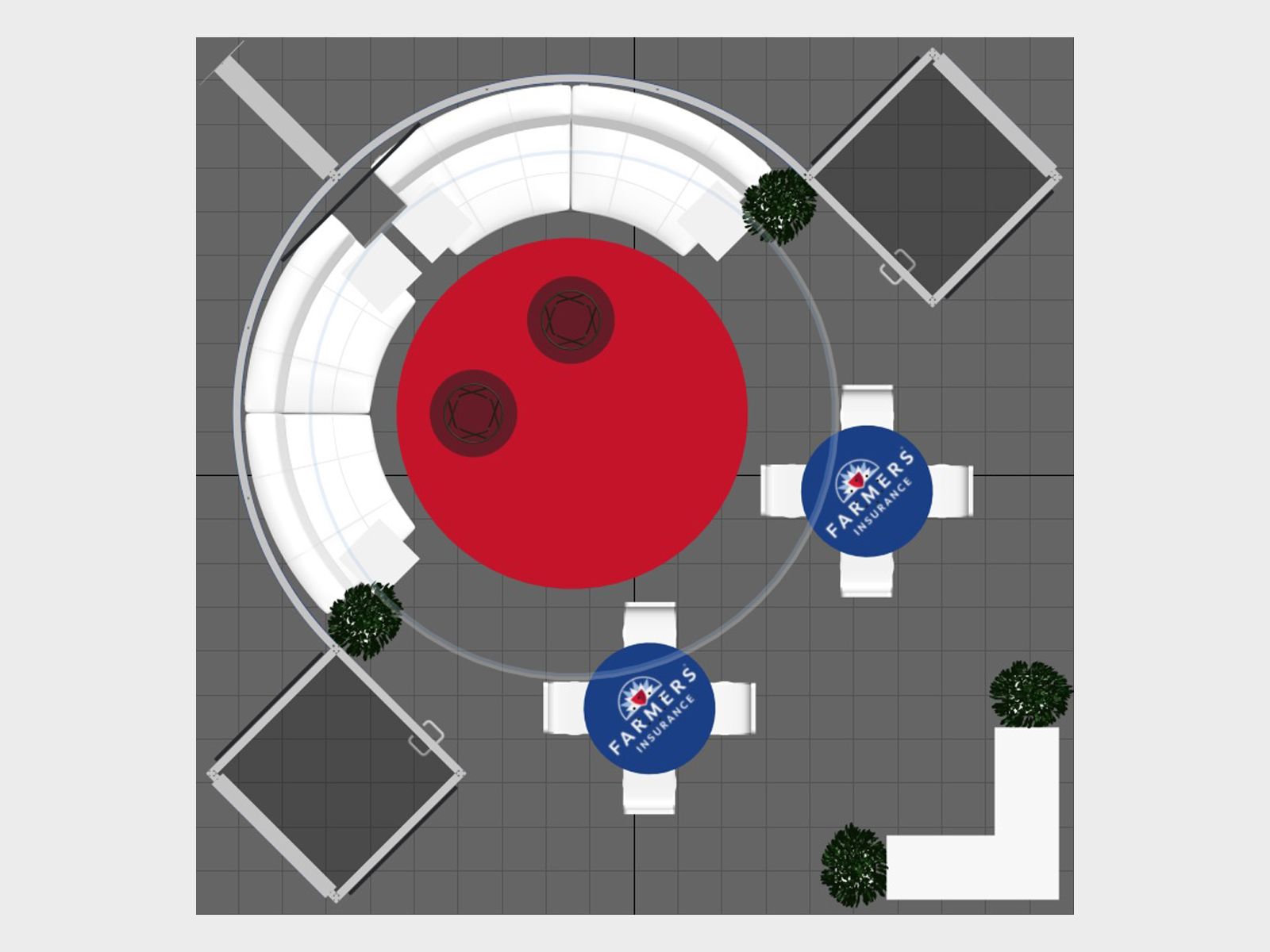 Every booth has a distinct vibe. The RE-9180 says, "Welcome! Please join us, relax, have a seat, and let's chat!" The island includes two charging tables with LED accent lighting for meetings. There's a larger seating area with curved soft seating sofas and coffee tables. Flanking the seating areas are two towers complete with monitor mounts, lightboxes, and locking closet storage.