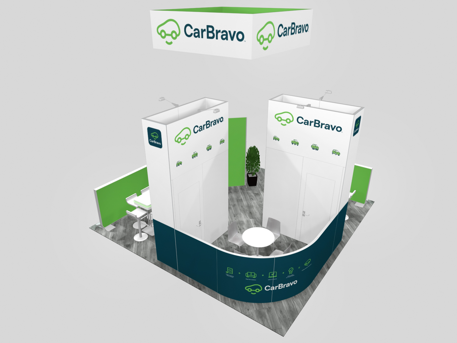 On one corner, there's a large backlit L-shared reception counter with storage. Behind the counter is a monitor kiosk, one of three large monitor options in the booth. Above, the 10' x 10' x 36" square hanging sign serves as a beacon in the show hall attracting attendees to your booth.