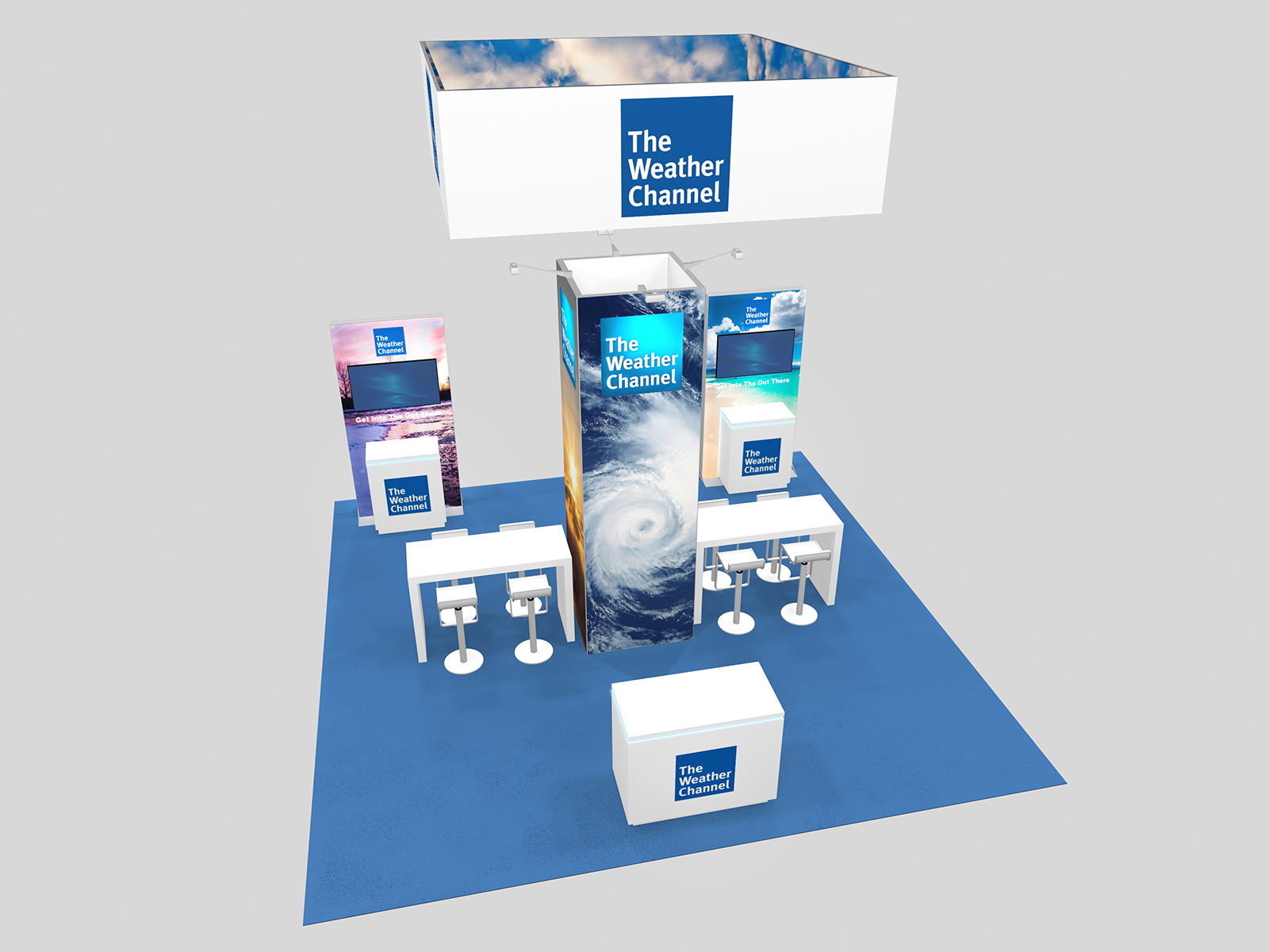 It's not complicated. Exhibitors often feel they need an elaborate, all "bells and whistles" design, when a straightforward exhibit would be more appropriate. The RE-9184, RE-9185, and RE-9186 are excellent island designs complete with large fabric graphics, high visibility, and practical accessories. Depending on the configuration, these rental exhibits include 12 to 16 ft. towers with locking storage, backlit workstations with monitor mounts, and locking storage. The RE-9184 even includes an impressive hanging sign.