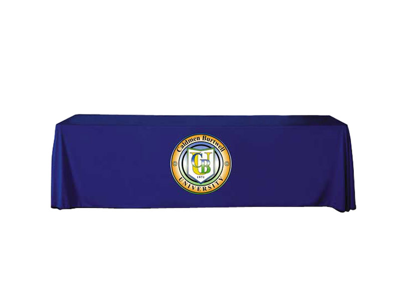 The Pronto retractable banner stand includes a three-segmented bungee attached mast. When the banner is attached to the mast at one-segment or two-segment height, this stand makes a perfect companion to your table throw.