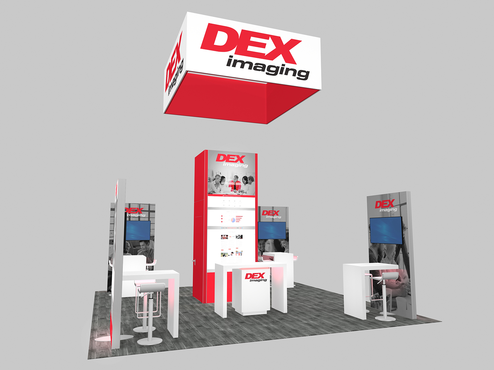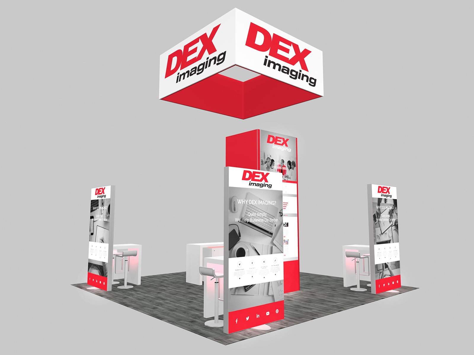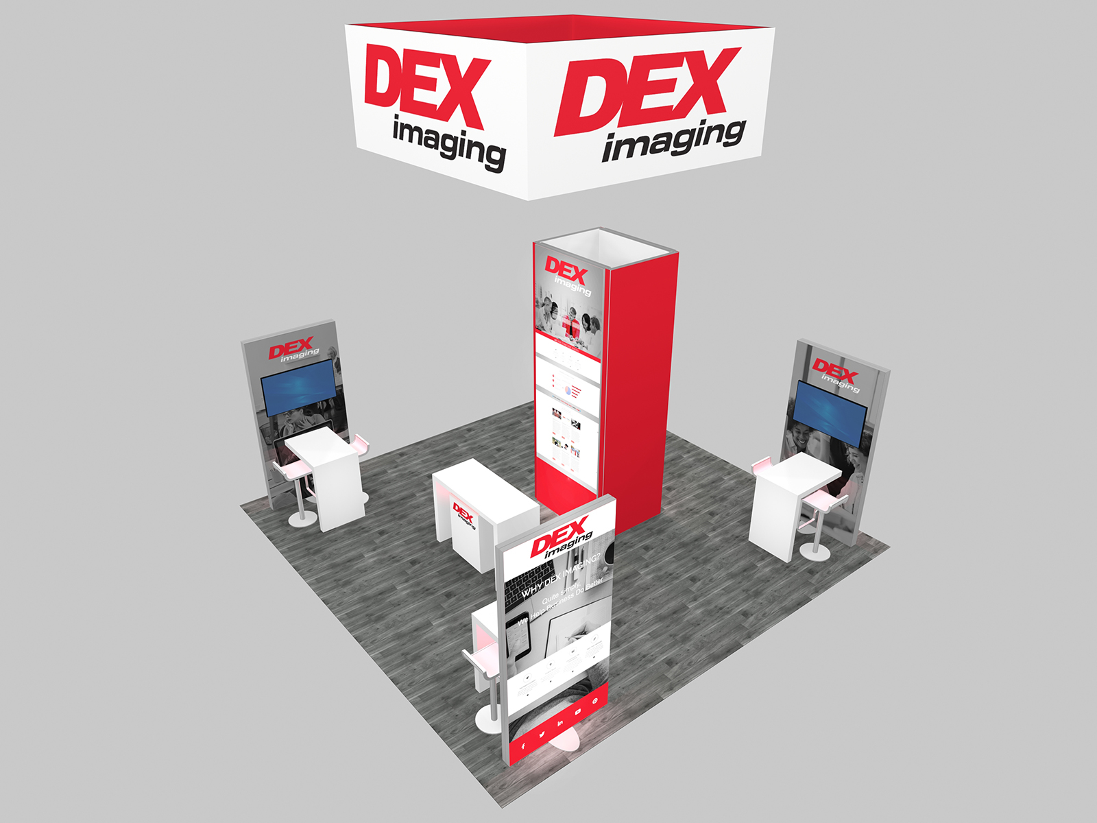 Surrounding the tower are individual workstations, each with a monitor, waterfall counter, and chairs. The workstations are connected to double-sided lightboxes which offer some privacy while highlighting the company's overall branding and messaging. For added visibility in the exhibit hall, the RE-9190 and 9192 include an overhead hanging sign position above the tower.