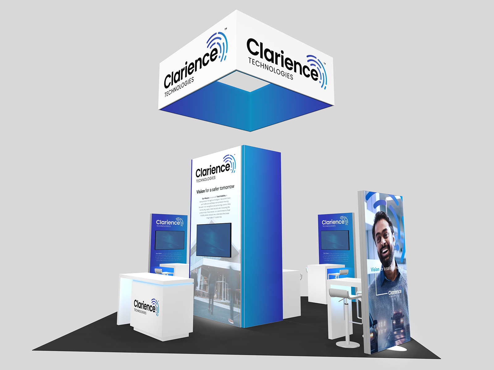 Surrounding the tower are individual workstations, each with a monitor, waterfall counter, and chairs. The workstations are connected to double-sided lightboxes which offer some privacy while highlighting the company's overall branding and messaging. For added visibility in the exhibit hall, the RE-9190 and 9192 include an overhead hanging sign position above the tower.