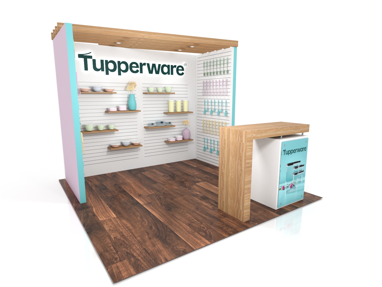Many exhibitors need extensive slatwall to display their products, but most slatwall designs are retail blah than trade show inspiring. The ECO-2126 and ECO-1092 shatter that expectation with a clean yet colorful exhibit. The sustainable inlines are reconfigurable, so shifting from a 10 ft. to a 20 ft. booth space is easy. They feature extensive slatwall, a halo-lit logo, and an upscale-looking pergola ceiling.