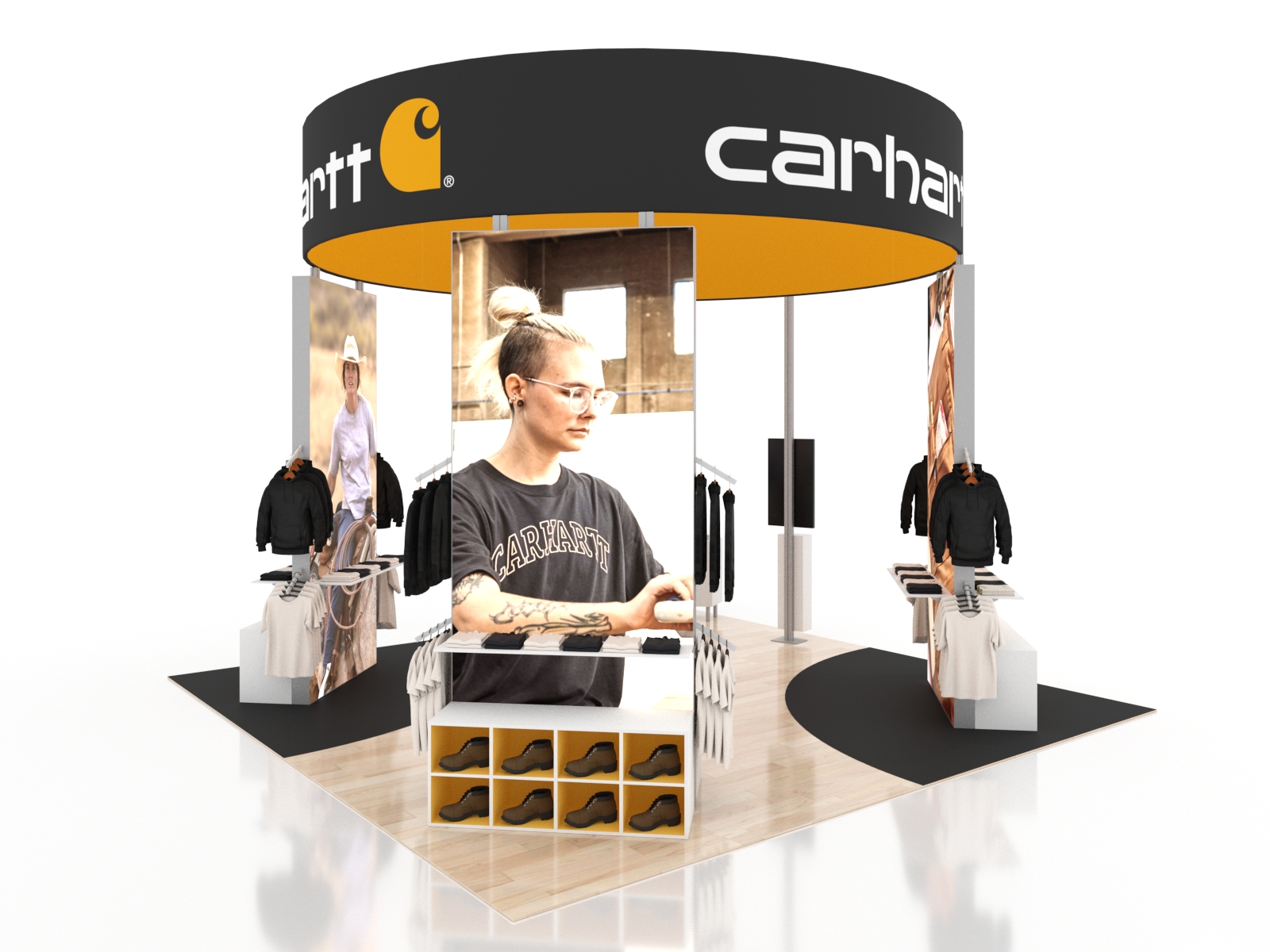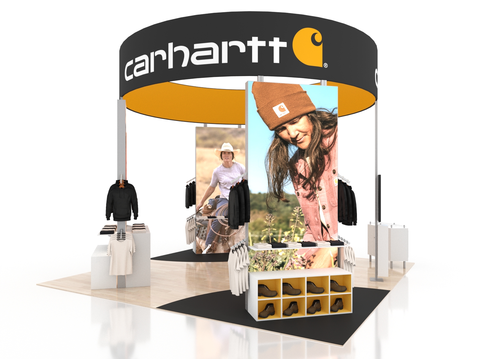 Once there, the island exhibit truly shines with practical display features like cubbies, shelves, and waterfall brackets. In addition, the design includes an attractive reception counter, ample locking storage for literature, promotional products, or personal items, and two monitor mounts for videos.