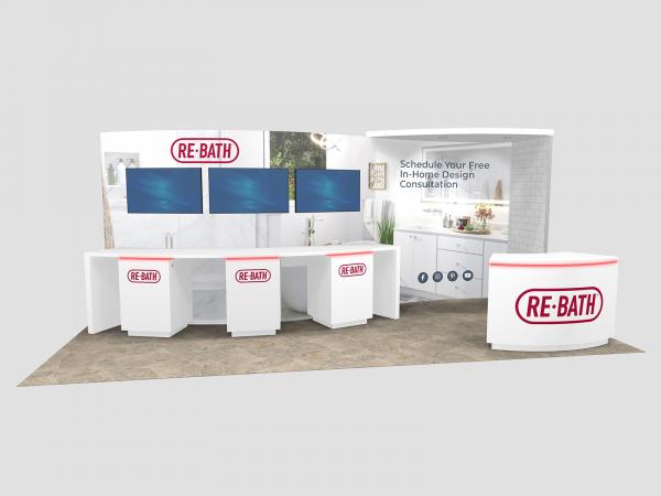 What's the difference between a rental and a purchase trade show exhibit? The price. Modern rentals include similar features and design options as a purchase display, but at a price that's typically 30-40% less. The RE-2151 series uses Gravitee Modular panels, tension fabric graphics, and custom counters to create an inviting space on the trade show floor. Plus, assembly is fast and easy with the no tools assembly.