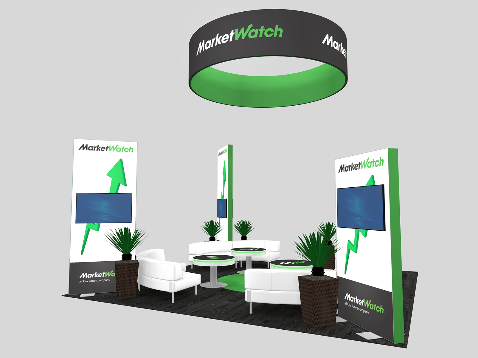 The VK-5202 places video towers on the corners and the open floorplan invites traffic into the extensive seating area with curved sofas and charging tables. The hanging sign attracts attention throughout the show hall while centering the seating area in the island.