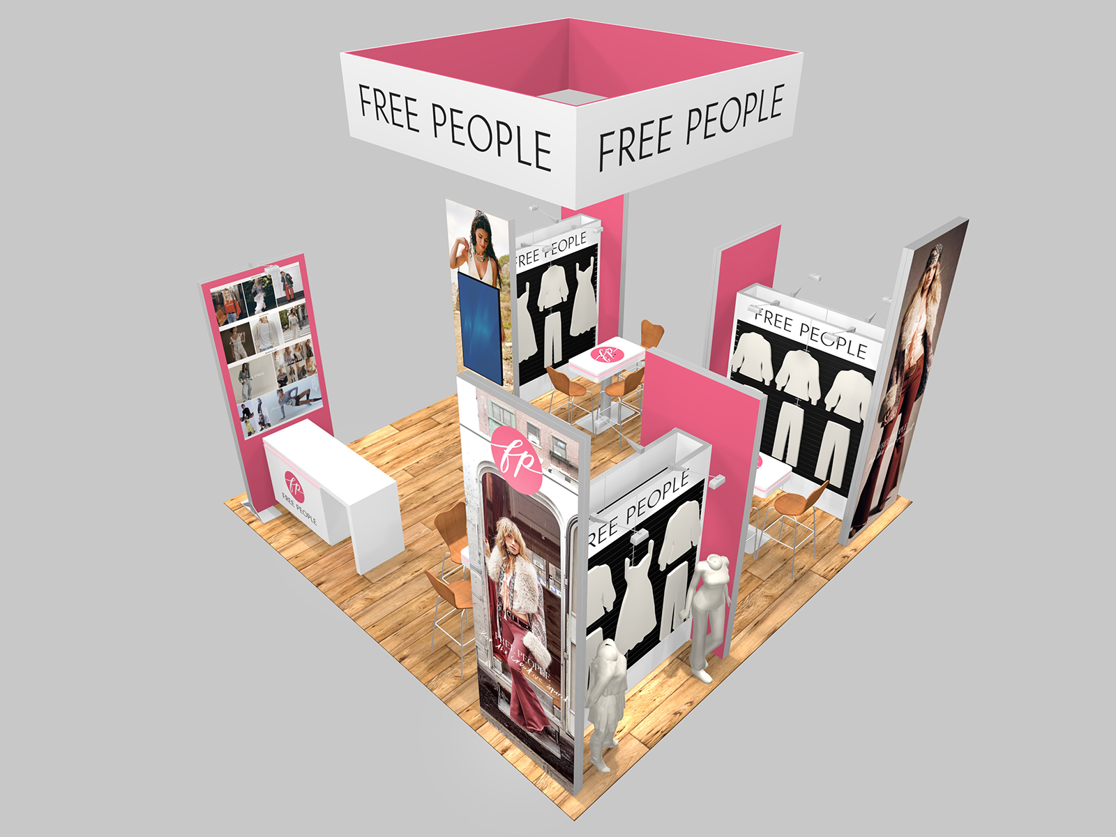 Many exhibitors don't need a traditional exhibit. They need a showroom with fixtures for products and tables to negotiate orders with clients. The RE-9216 optimizes both efficiently in a 20 x 20 space. It includes three seating areas with charging tables, along with slatwall fixtures for product displays. In addition, there are large format backlit graphics to attract attendees and extensive graphic surfaces for messaging and branding.