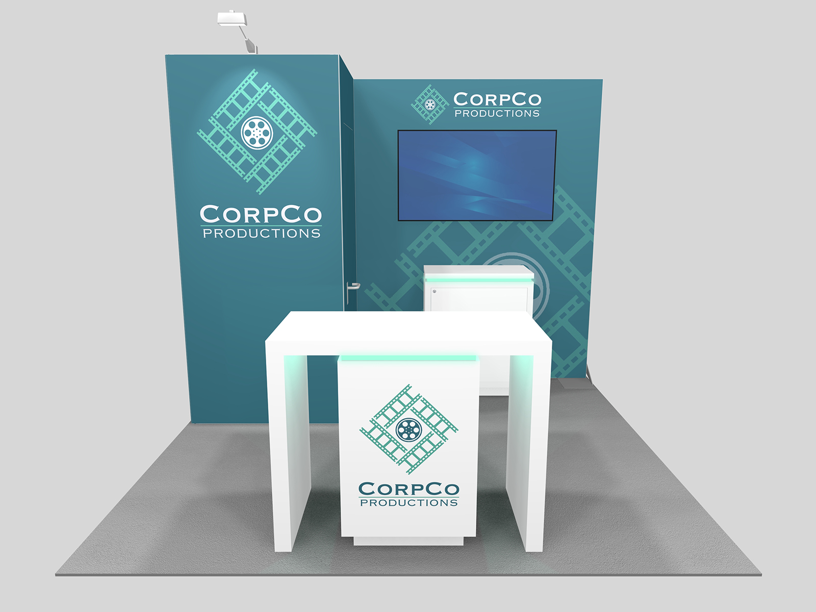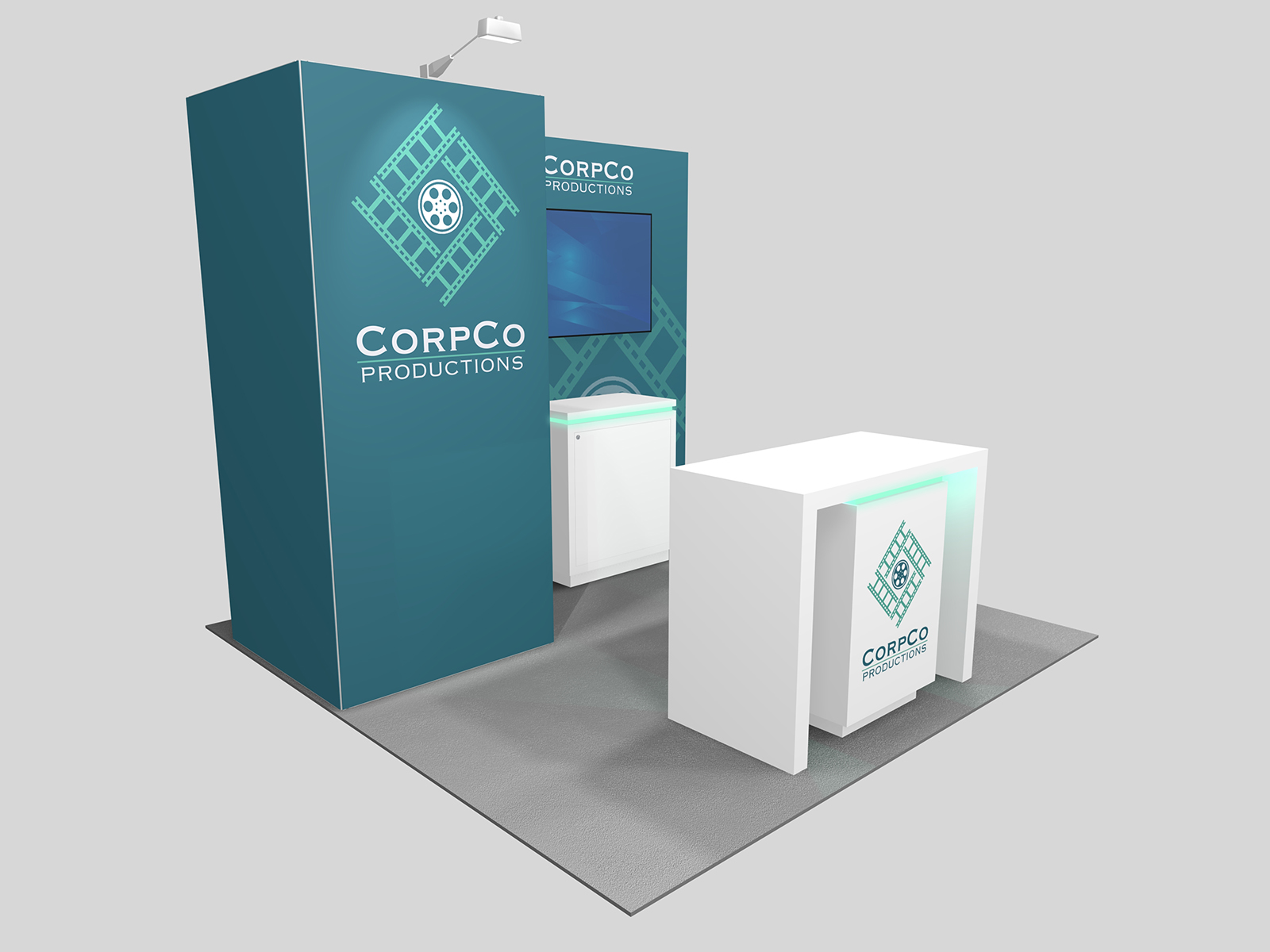 Quite often, a few custom elements added to the design can give the entire design a custom look even if it’s as simple as some colorful laminated workstations, shelves, or a reception counter. Custom laminated soffits and backlighting are also nice touches that are inexpensive and well worth the investment. As a bonus, if you re-rent the same exhibit, your second rental will most likely be less expensive, since your first rental covered the cost of those custom components.