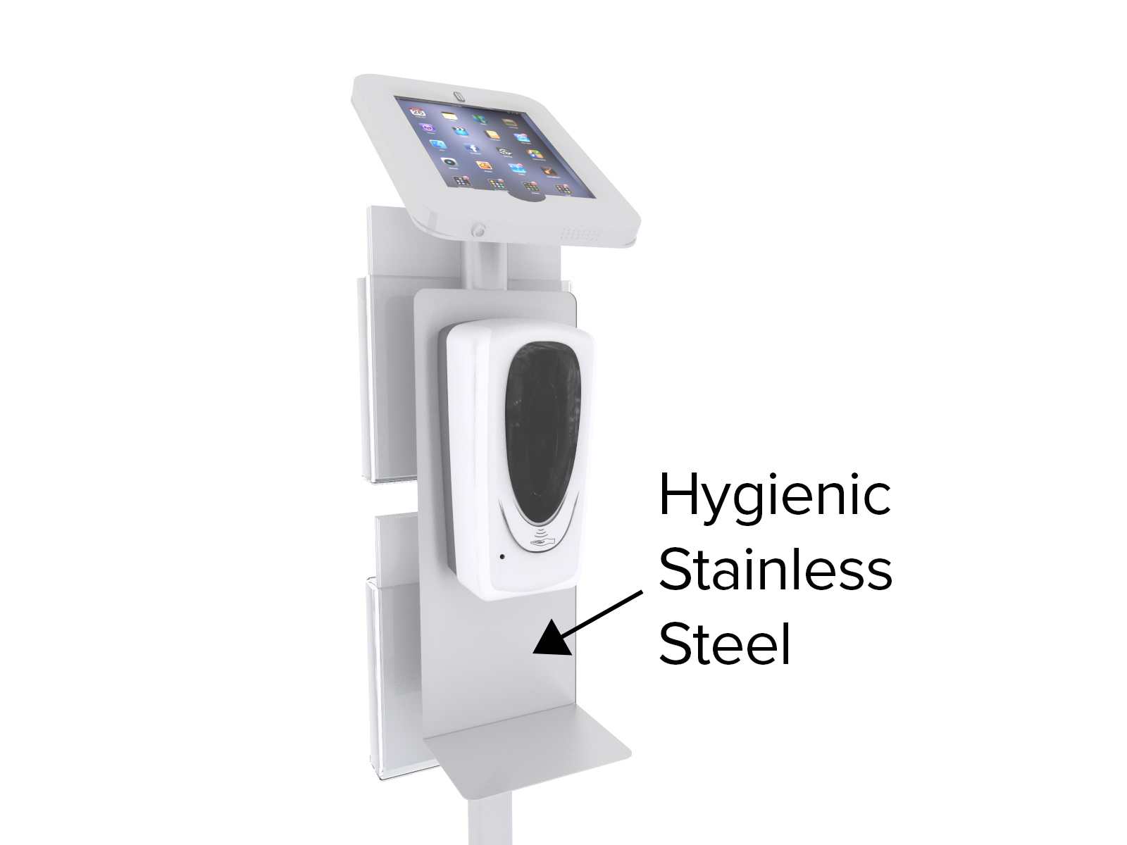 Most hand sanitizer stands are flimsy and disposable. Built for short-term use and then replaced. The Stand Tough Sanitizer Stands are designed for years of active use using engineered aluminum extrusion and solid steel base plates. The powder-coated finish and stainless steel mounting plate makes them easy to clean and resistant to scratches and chips. Assembly couldn't be easier, taking just minutes using a hex key tool (included). The 1377, 1378, and 1379 versions include a secure tablet enclosure and optional graphics and literature holders
