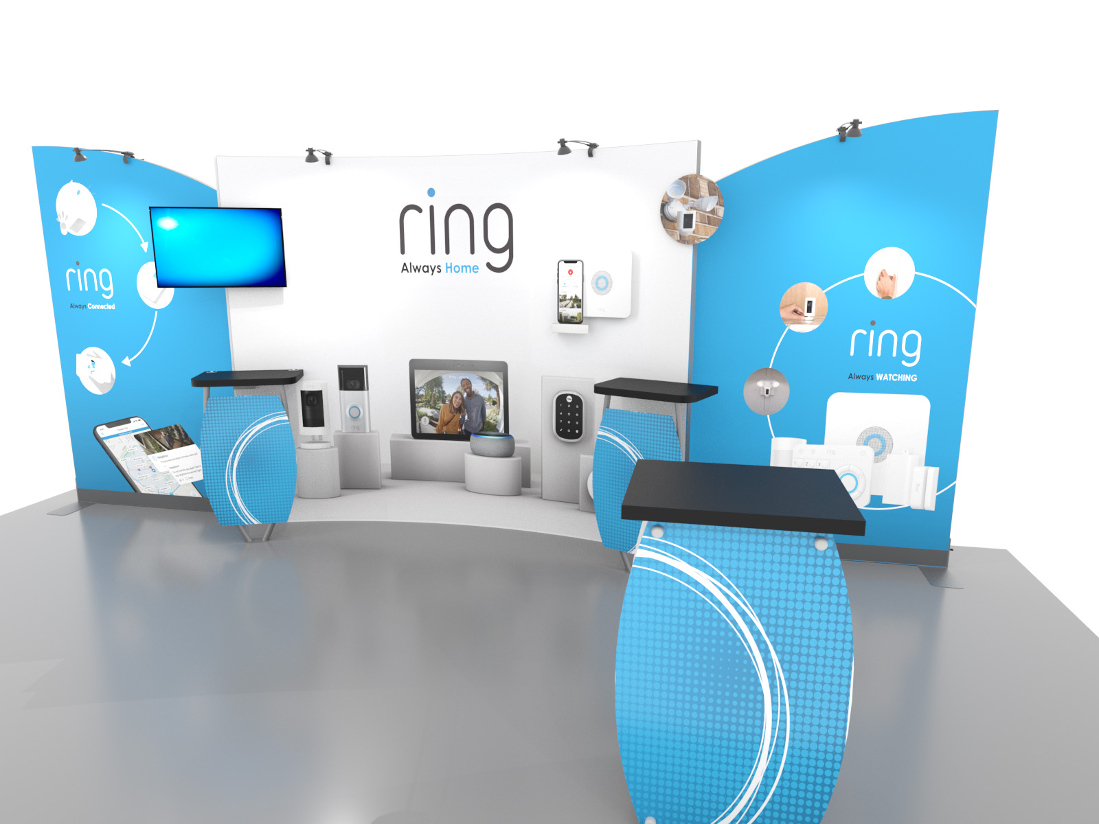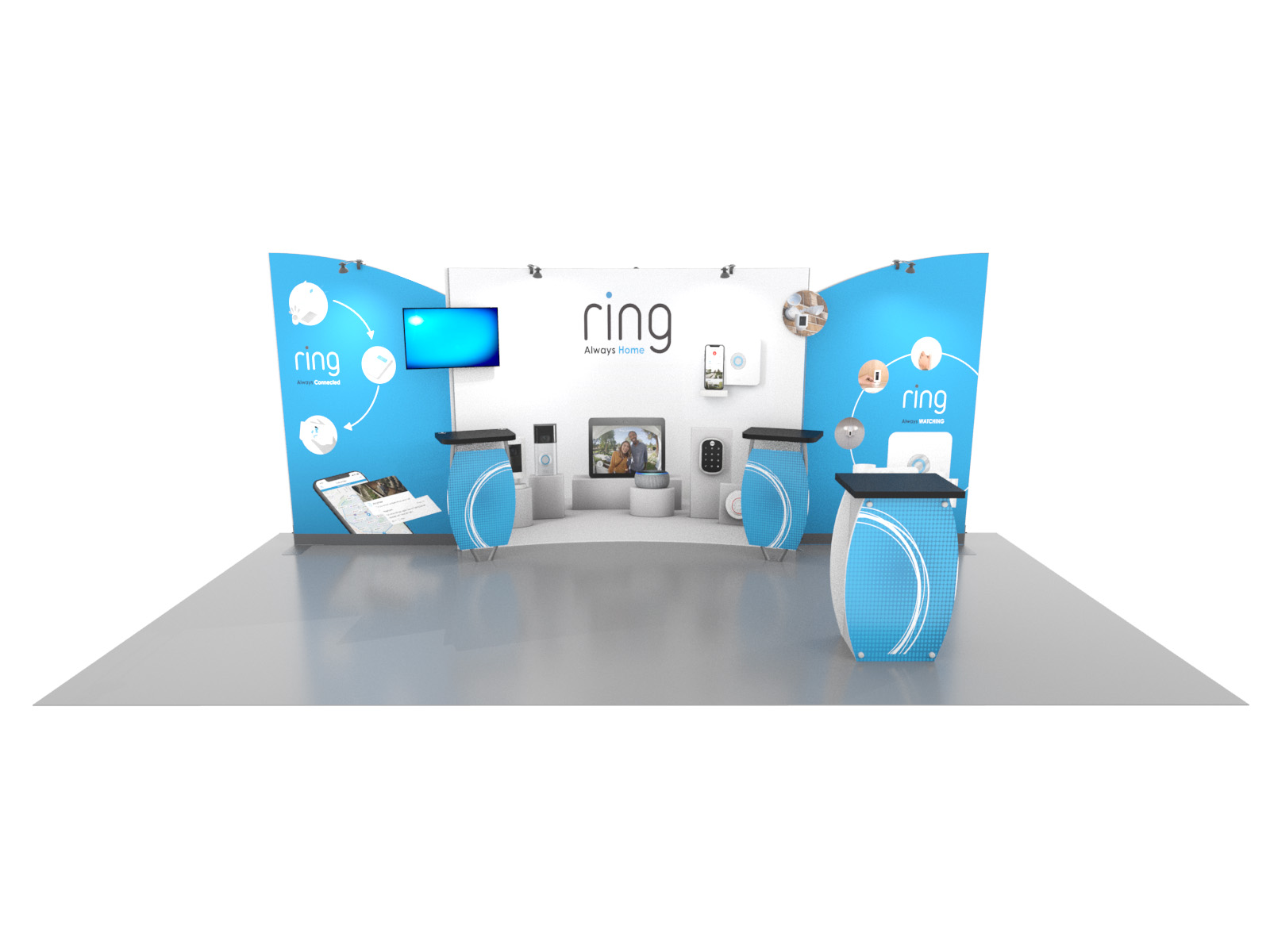 Personalize your Symphony Display with attractive counters, workstations, floating graphics, iPad clamshells, and monitor mounts. The lightweight aluminum frames are engineered for SEG dye-sublimated fabric graphics for a seamless, wrinkle-free look. Add floating graphics for additional visual layering and branding.