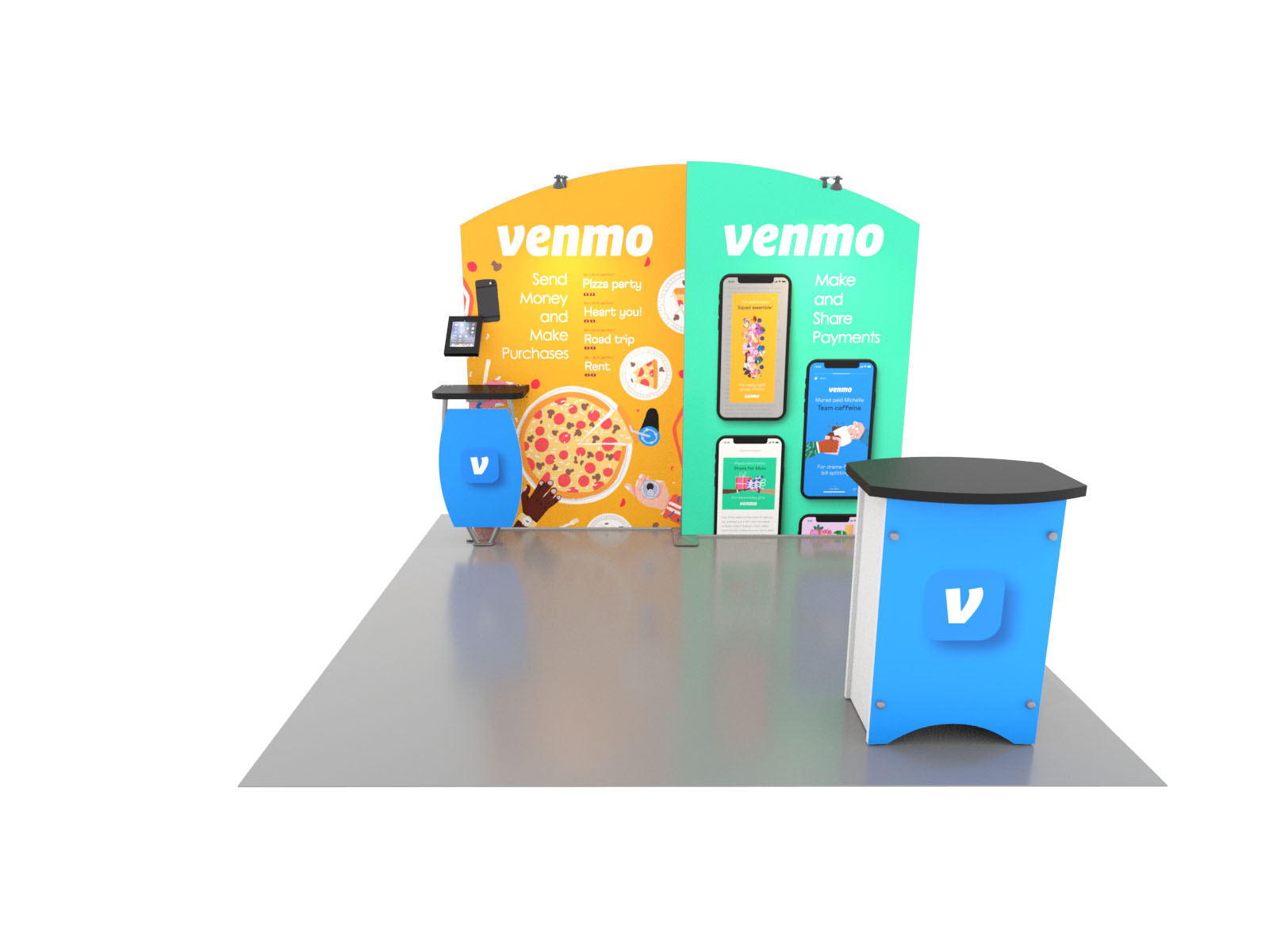 Personalize your Symphony Display with attractive counters, workstations, floating graphics, iPad clamshells, and monitor mounts. The lightweight aluminum frames are engineered for SEG dye-sublimated fabric graphics for a seamless, wrinkle-free look. Add floating graphics for additional visual layering and branding.