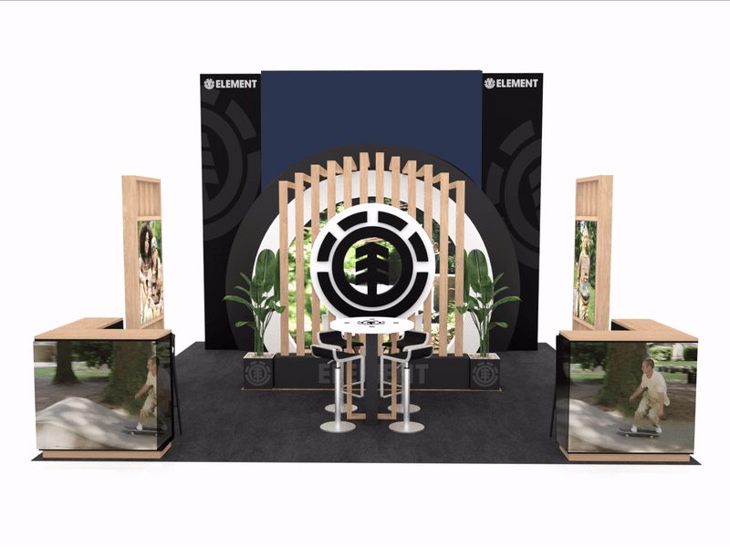In addition, the series includes two seating areas, reception counters with locking storage, a head-turning pergola, and custom double-side lightboxes.